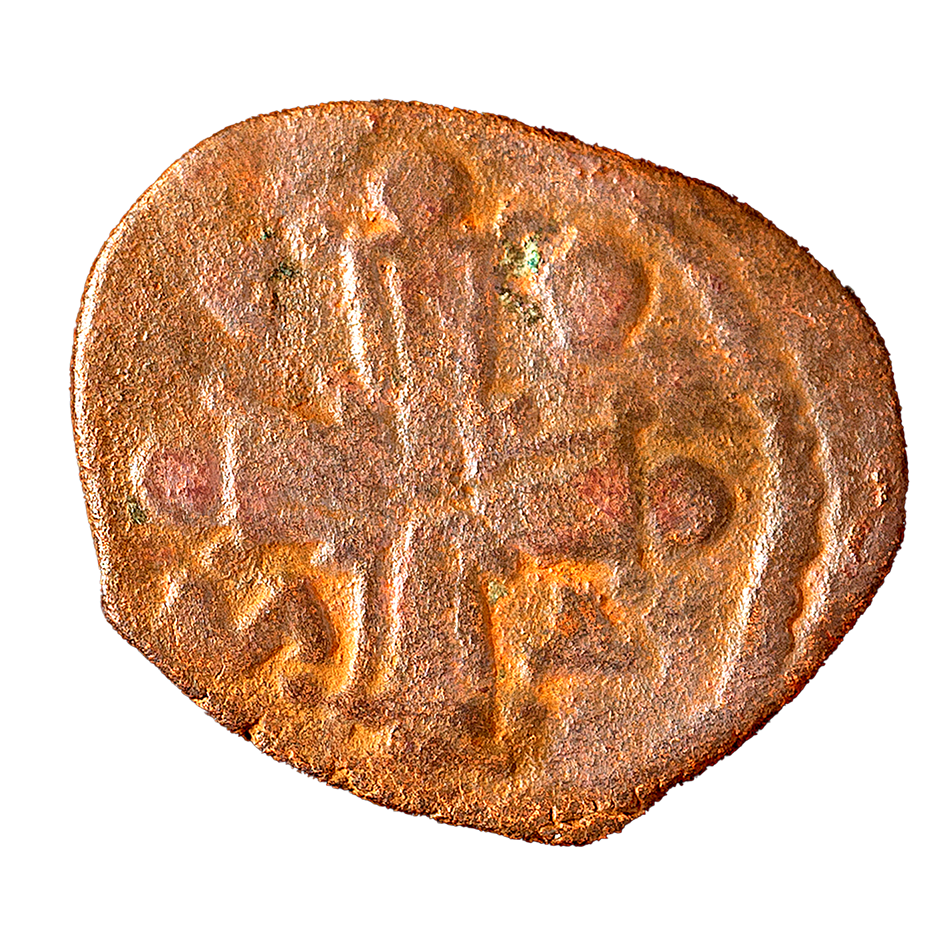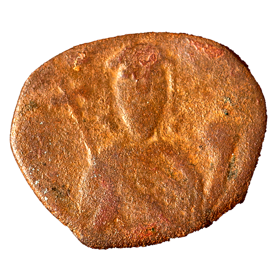 Facing bust of emperor wearing stemma, divitision, and jeweled loros, holding globus cruciger in left hand and scepter cruciger in right hand (schematic?)