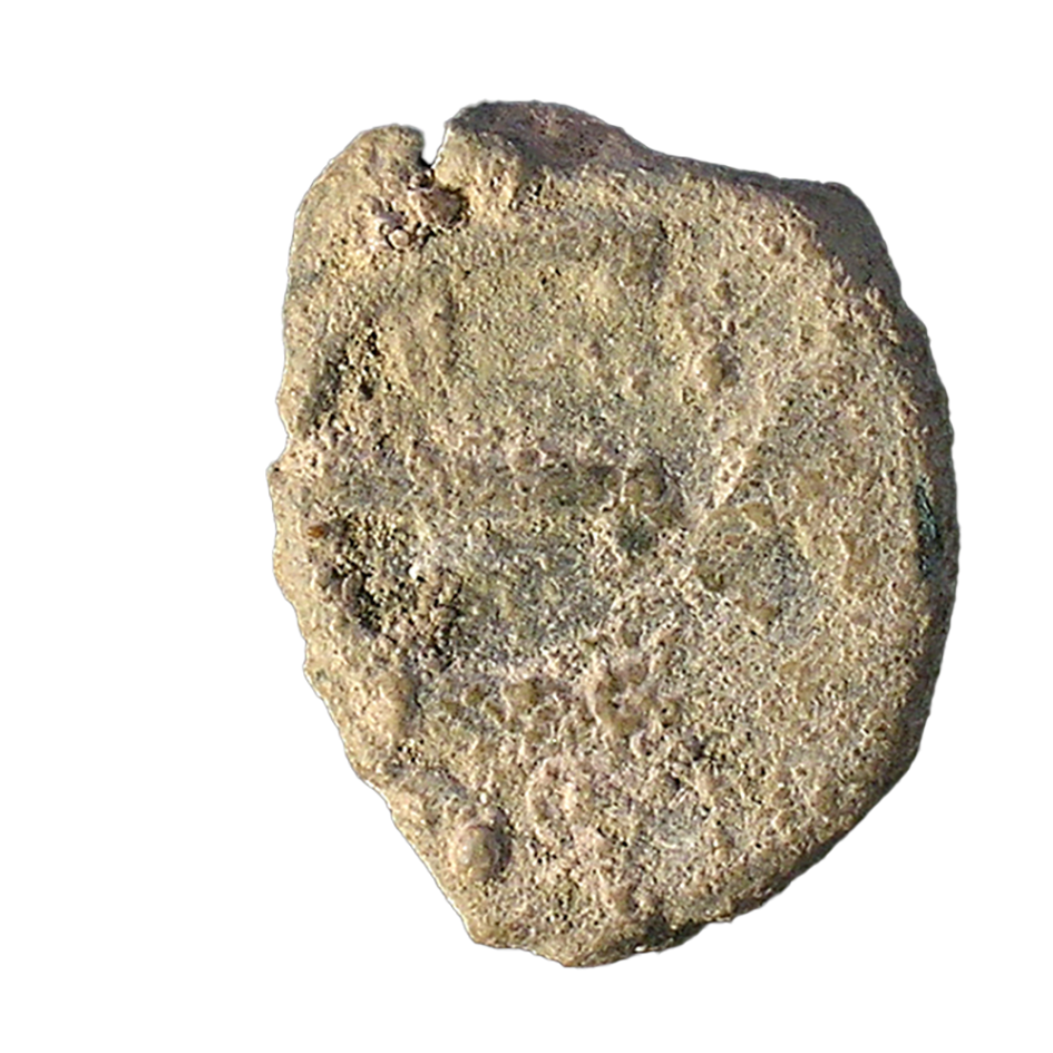 Wear: VF. Roughly 20% snapped off edge from obverse left and lower right; deep crack along edge. Extensive, thick patches of pale green bronze corrosion on both faces.