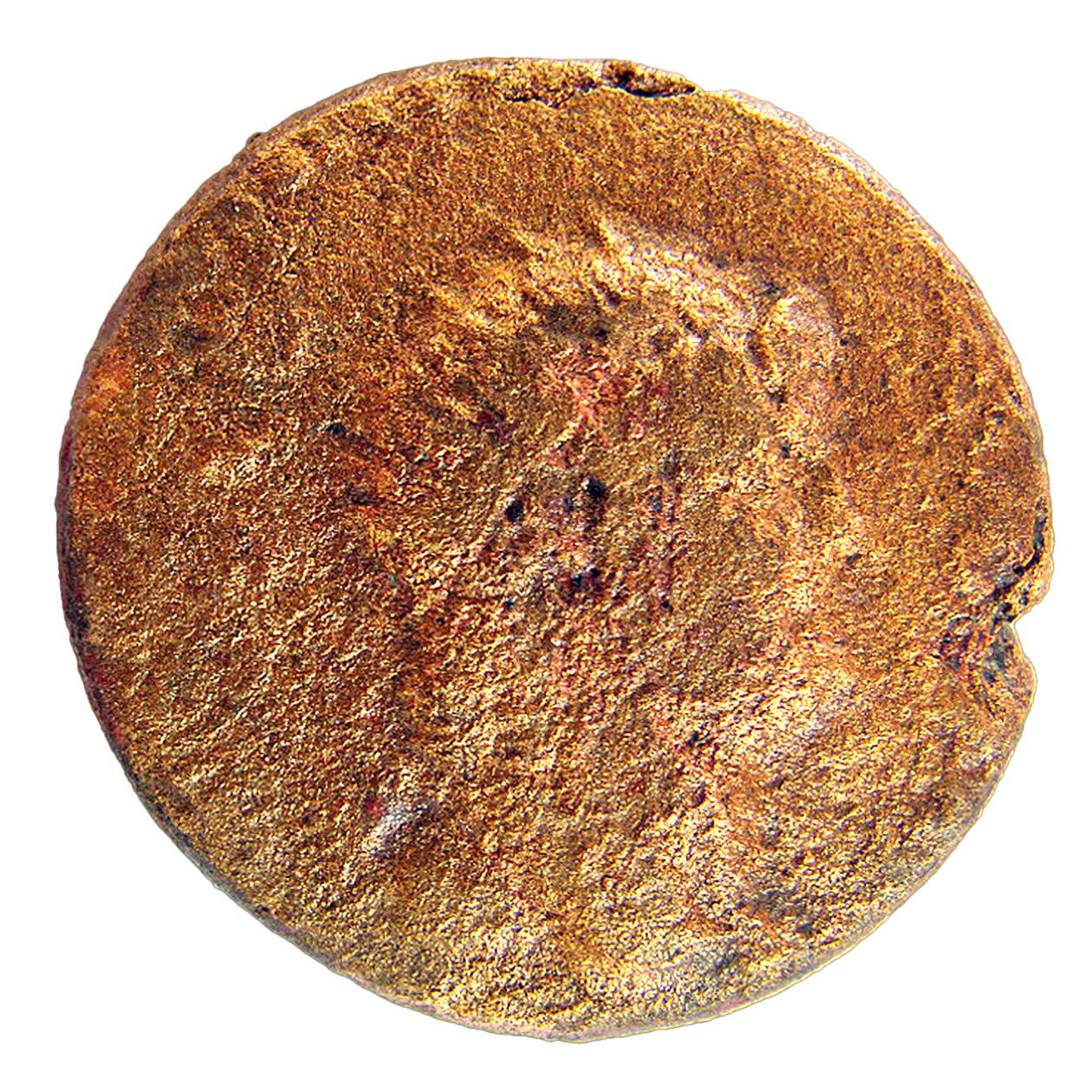 Wear: F. Slight, somewhat extensive pitting and scratching; two deep chips along edge. Scattered, small patches of green bronze disease.