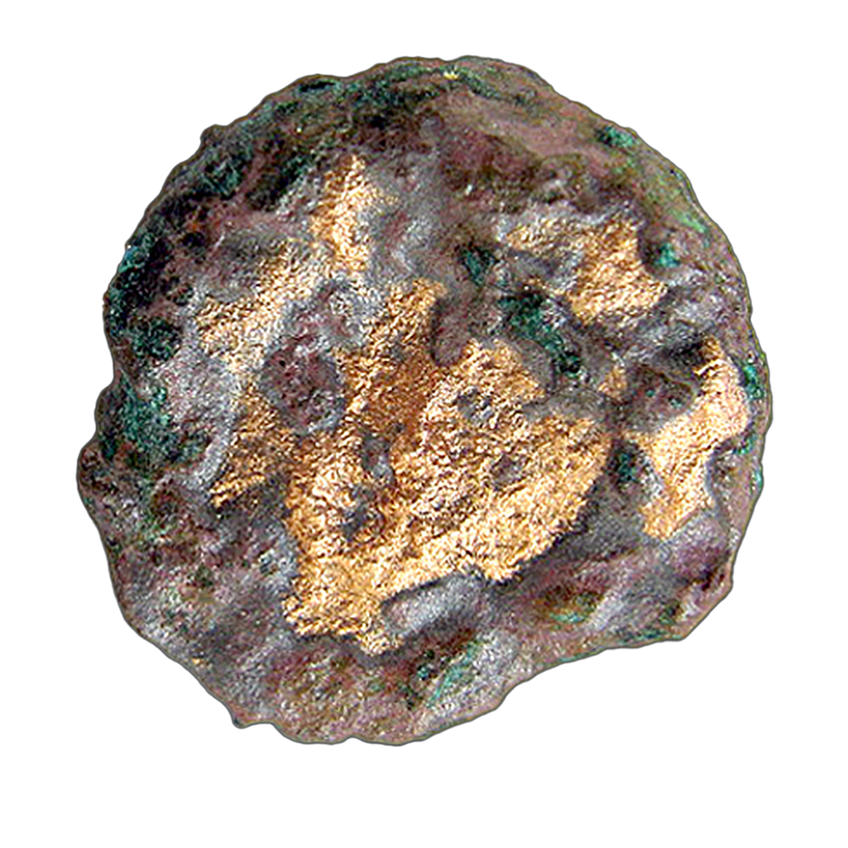 Wear: G. Extensive, moderate to severe pitting to cratering across both faces; small to large arcs of margin nicked and snapped. Thick, irregular, dark green bronze disease on both faces.