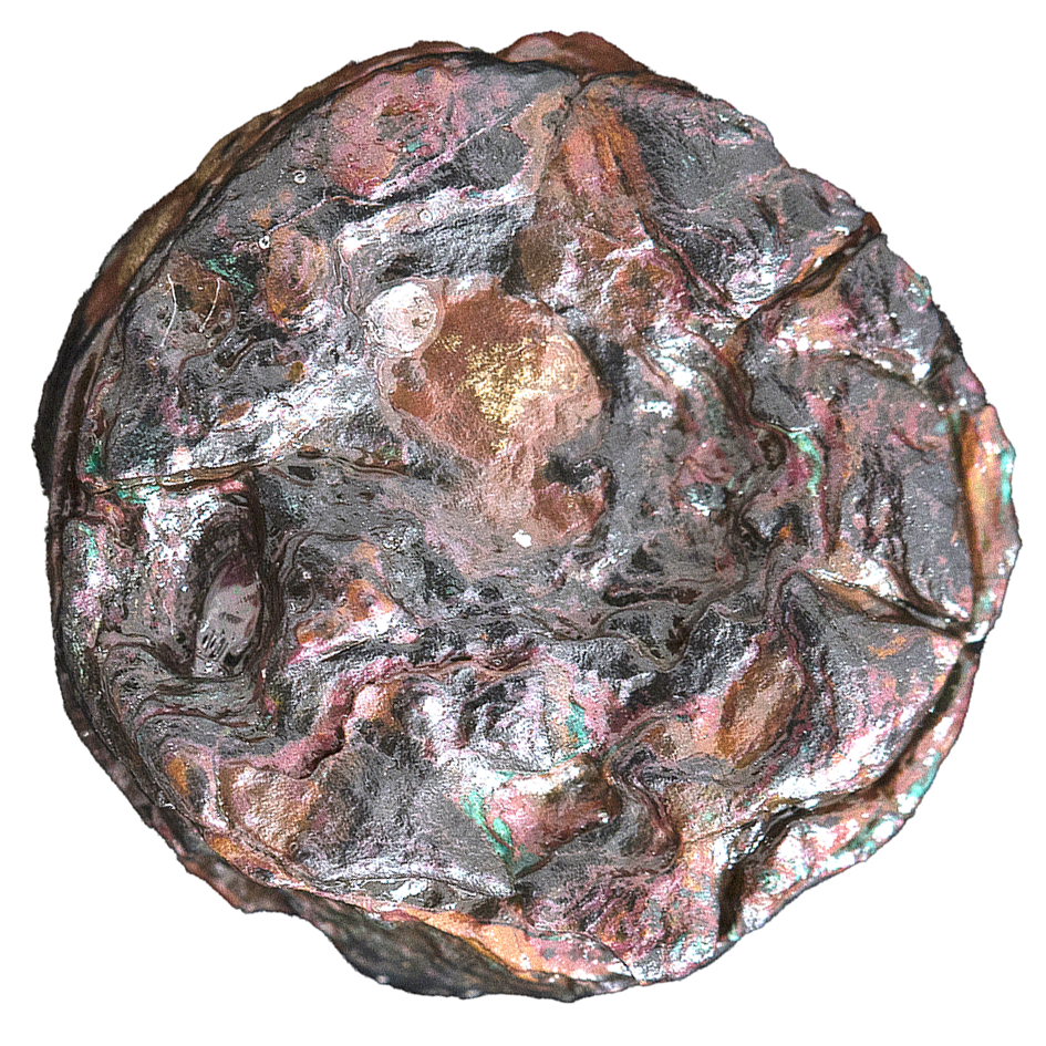 Wear: P. Extensive, moderate to severe cratering and infrequent, deep surficial cracking; slightly nicked edge. Thick extensive, green to dark bronze corrosion.