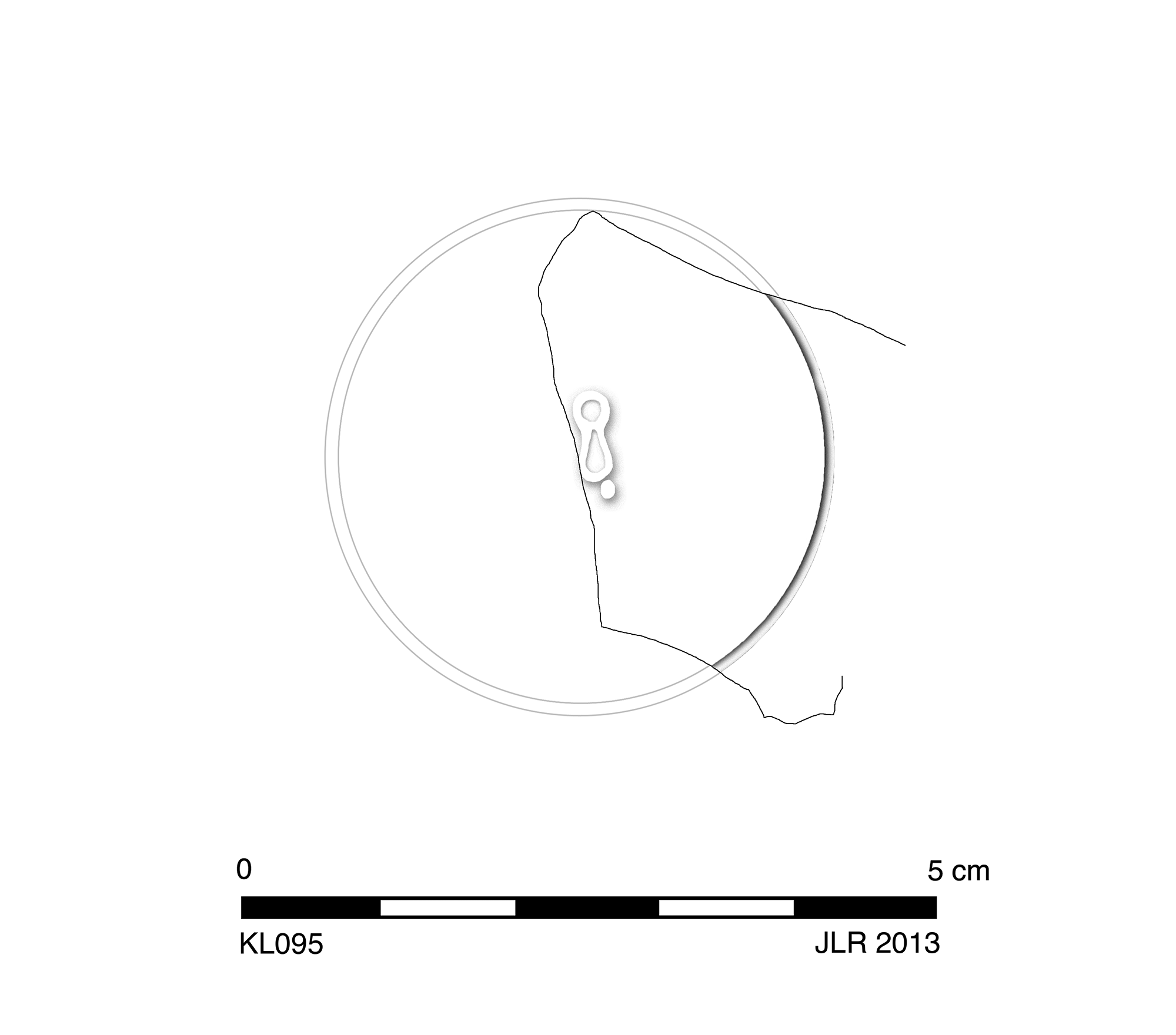 Ten fragments, seven joining and three nonjoining, preserve 75% of discus, 66% of shoulder, entire handle, and 66% of base. Slight abrasion, gouging, and encrustation around handle.