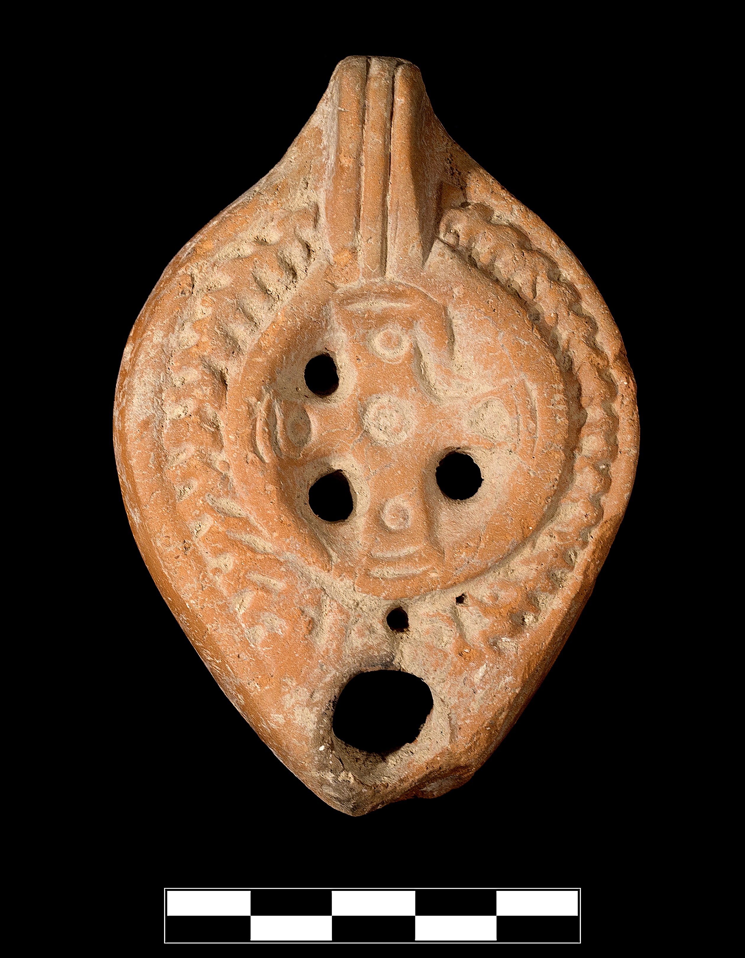 Tear-shaped outline. Circular, concave discus with raised rim has relief of cross monogram with rho (small loop) open right, four single circles at ends of arms and one double circle at intersection, and single transverse grooves at ends; three holes in quadrants. Sloping shoulder has herringbone in low relief. Rounded nozzle framed by single angled grooves has airhole at top flanked by single circles and a short groove to wickhole; traces of burning. Short, thick, solid handle has two grooves; lower handle has flanking grooves. Slight webbing. Flat base has three single circles at top and one at bottom and double almond-shaped grooves around incuse signature: ΗΡ|Ν(?)[.|ΟΥ (reading uncertain).