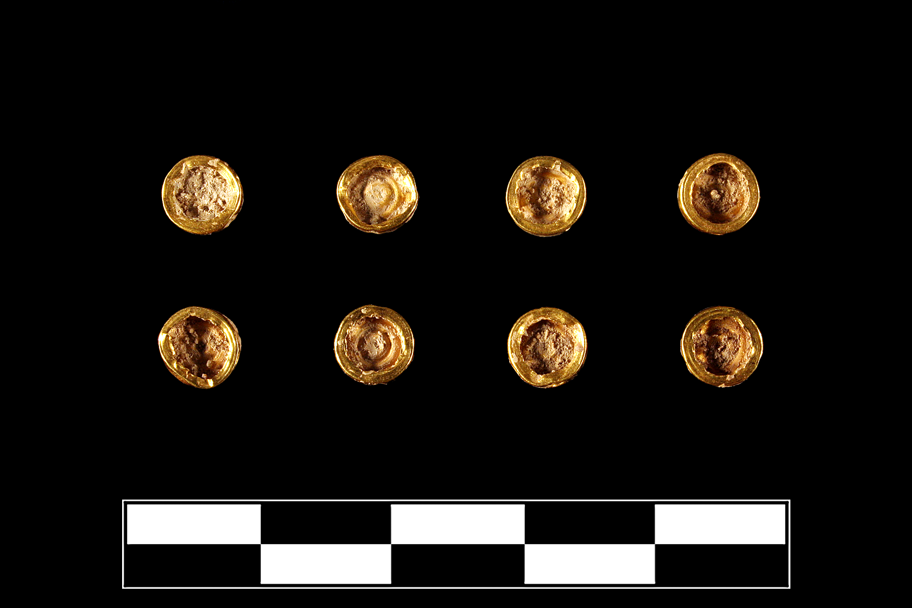 Eight gold buttons or gold-foil button sheaths. Thin, discoid sheets with con-centric circles molded in relief on top and with hollow interiors. Since these were so delicate, perhaps they were once wrapped around a discoid form to hold shape. Around sides are eight holes in pairs through which thread or very thin wire was passed for attaching them to a hard core or sewing them onto fabric.