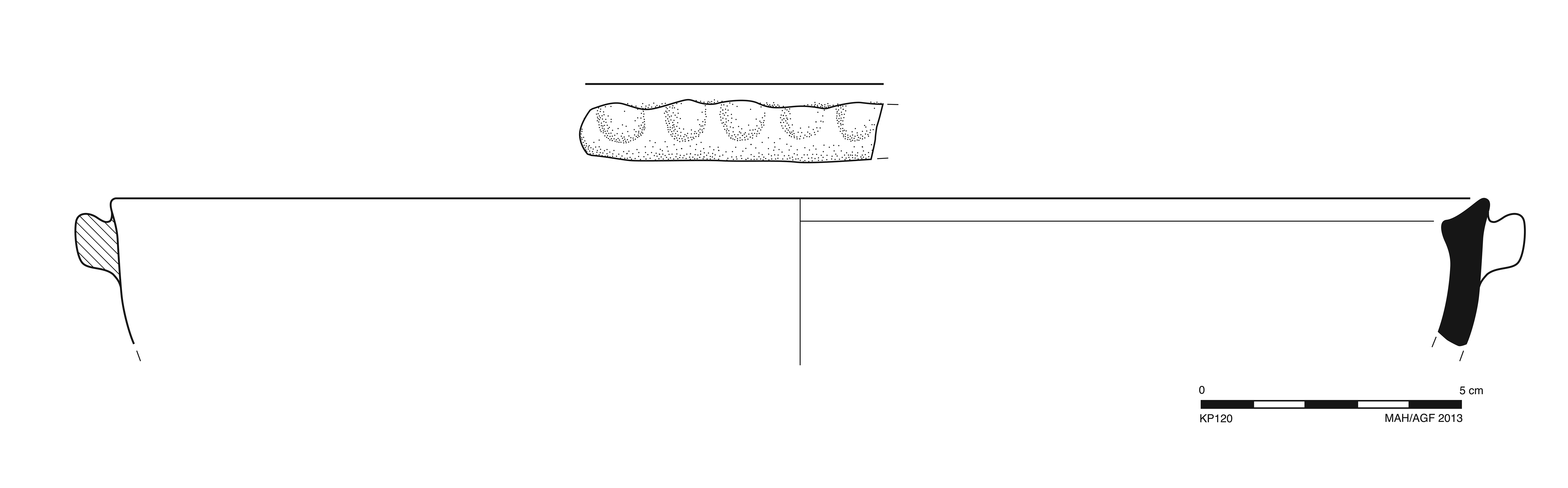 Slightly convex body. Flaring, thickened rim with tapering lip, almost pointed; small, triangular flange on interior. Lug handle with piecrust, triangular in section, applied just below lip. Scorching on piecrust from use?