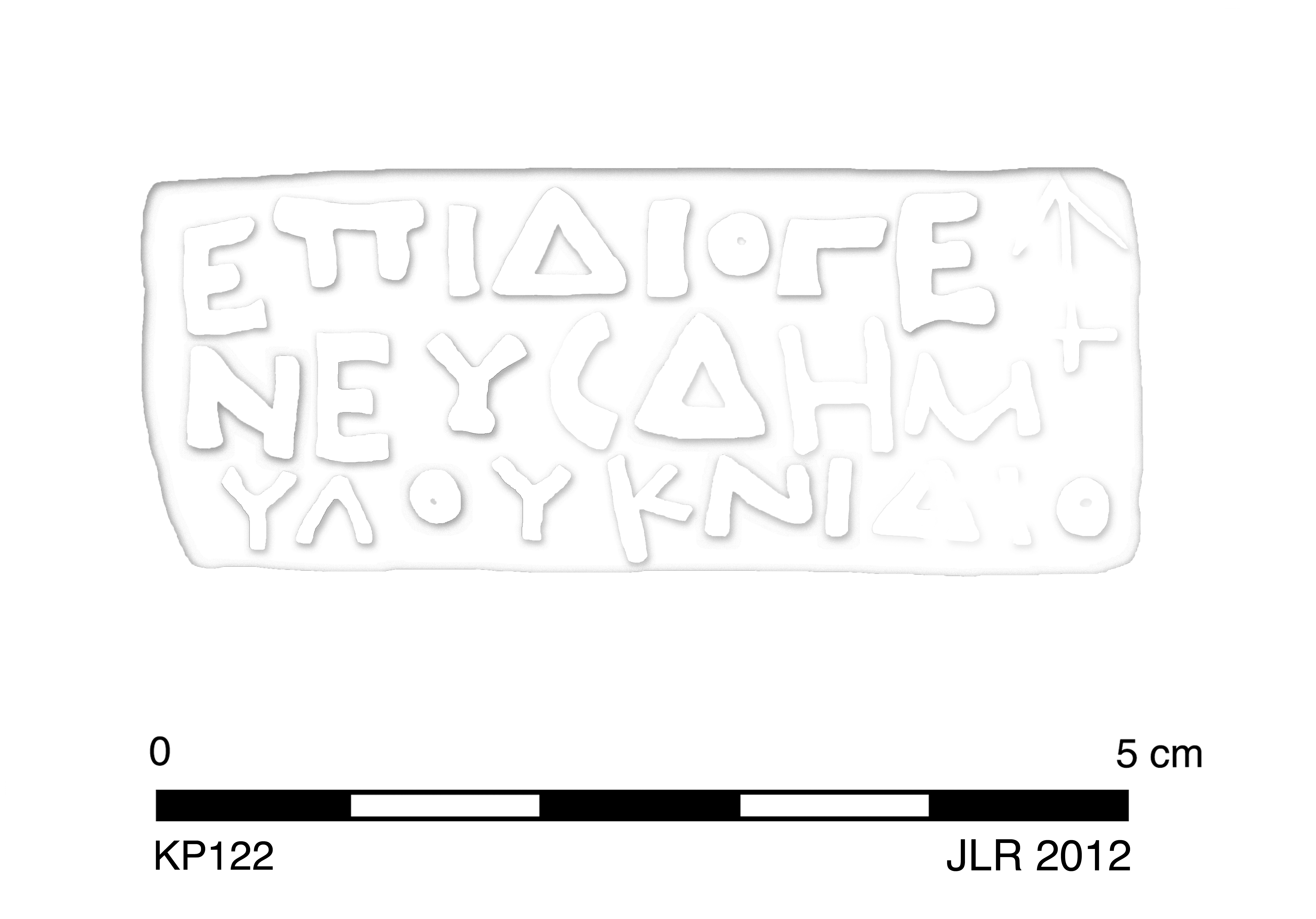 Arcing strap handle, elliptical in section, broken from upper neck of amphora. Impressed rectangular panel on top bears stamp of Knidian origin in raised letters: ἐπὶ Διογέ|νευς Δημ|ύλου Κνίδιο[ν] (inverted anchor?) (“Knidian product of Dem(o)ulos, under Diogenes“).