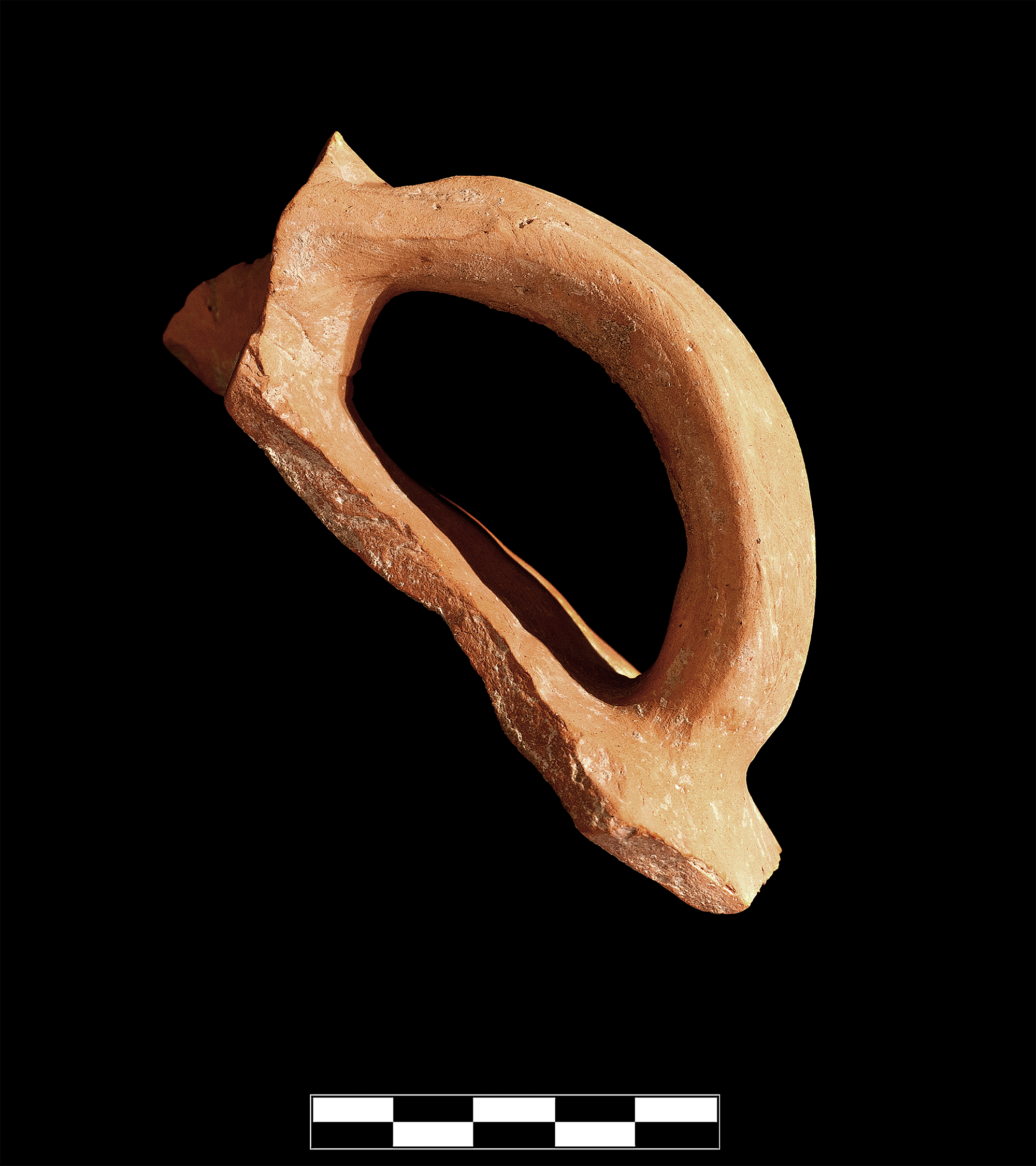 Sloping shoulder; cylindrical neck. Spined, oval handle attaches to middle neck and shoulder.