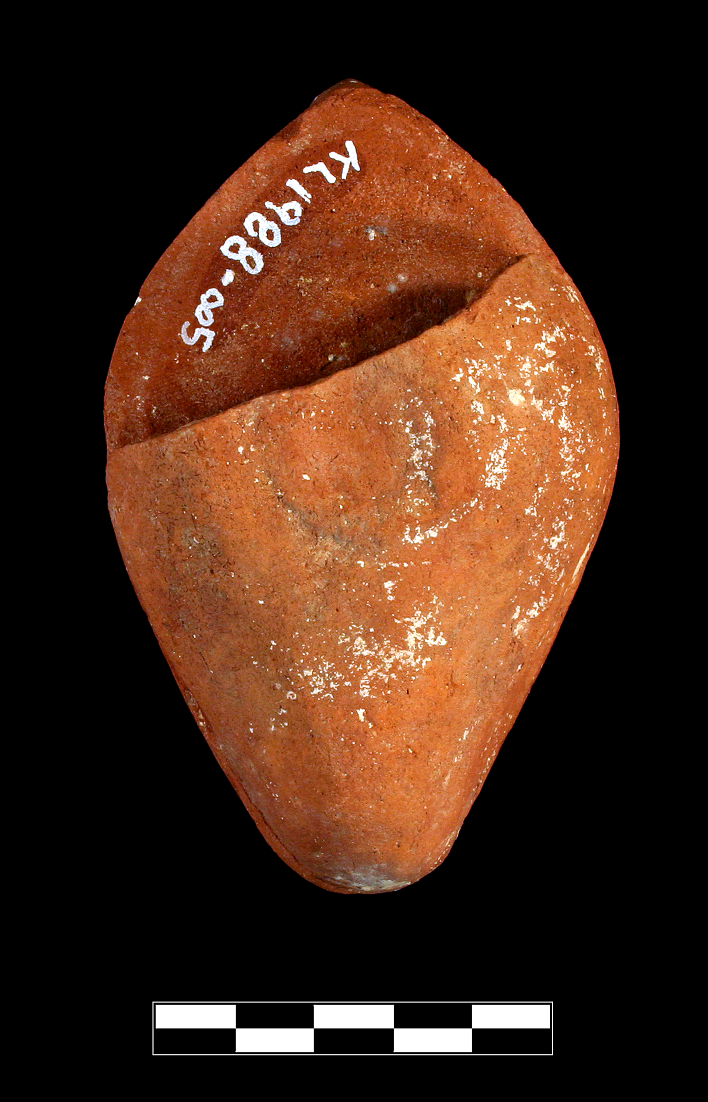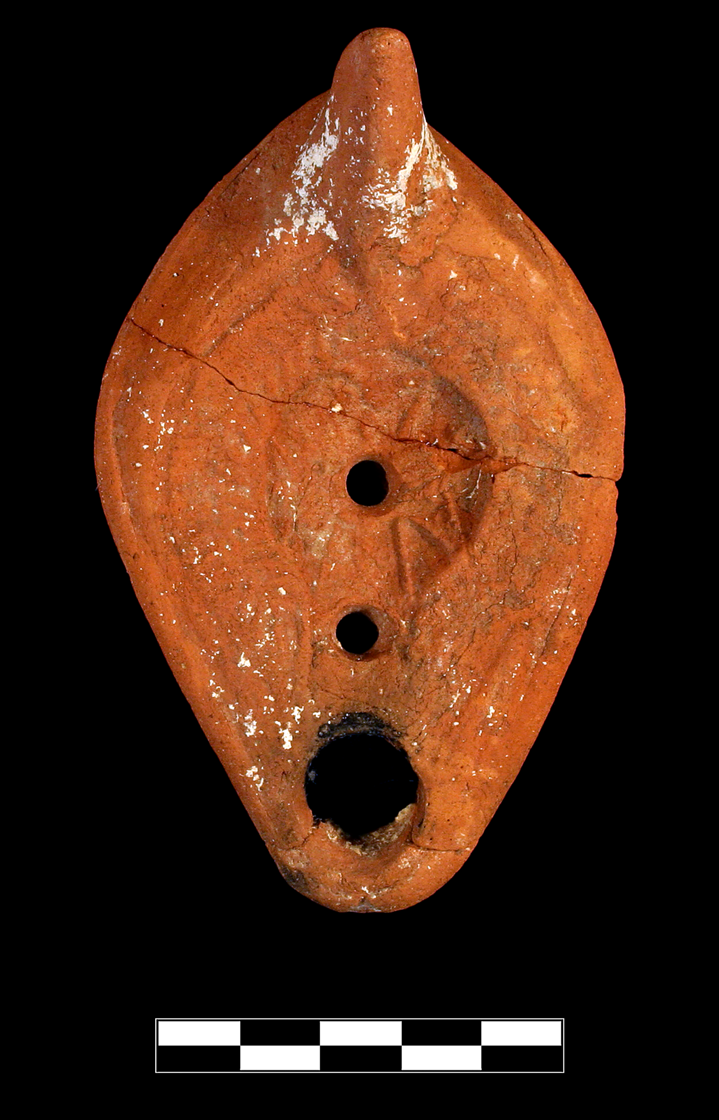 Two joining fragments preserve most of lamp but missing one-third of base. Severe, extensive abrasion; slight, extensive patches of encrustation.