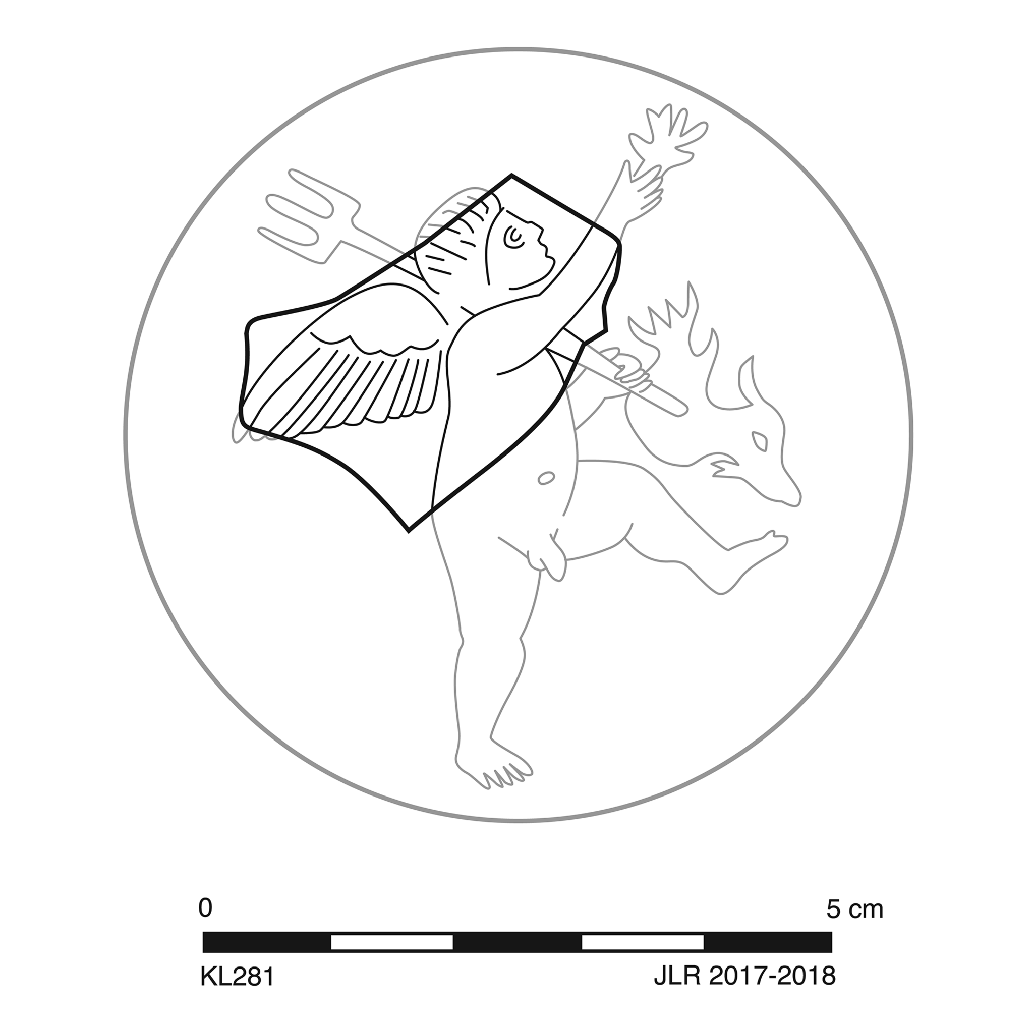 Concave discus has relief of winged Eros facing right and reaching up with left arm; traces of trident in background. This type has dolphin center right.