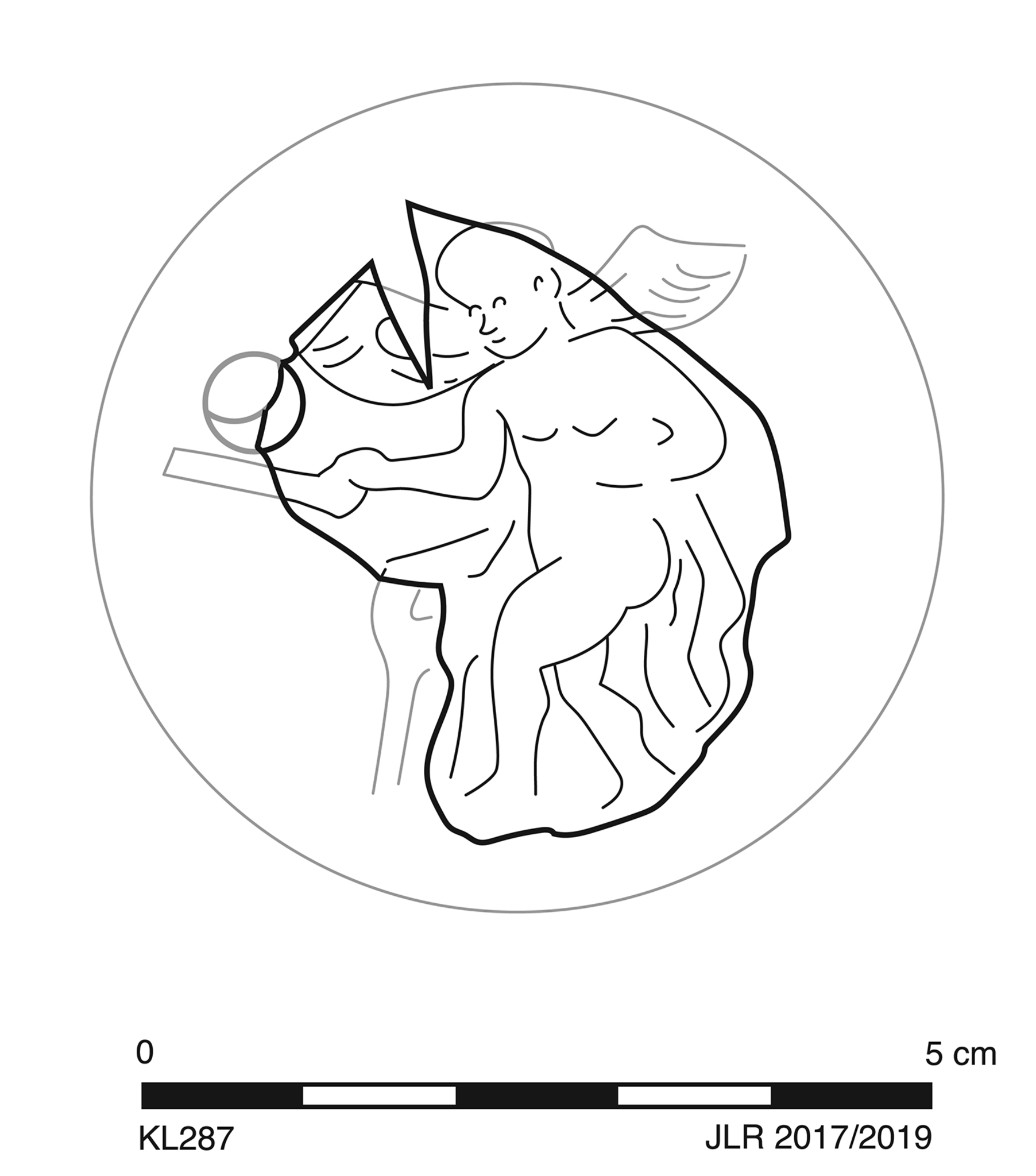 Concave discus has relief of Eros striding left with wings spread, right arm outstretched with patera(?) and left arm flexed at side, surrounded by loose drapery or other background.