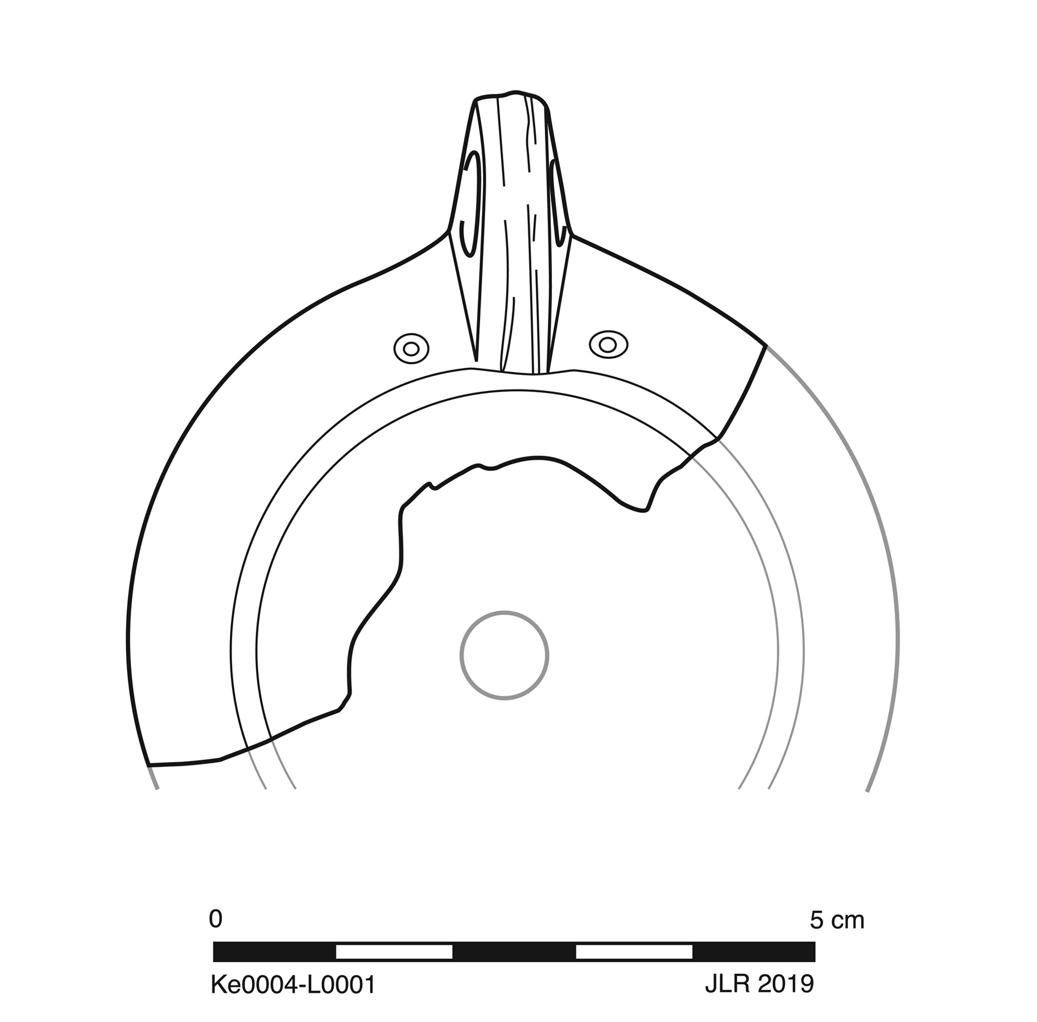 Two joining sherds preserve ca. 33% of left lateral to back shoulder, small part of adjacent discus and wall, entire handle, and ca. 20% of base. Slight, sparse abrasion and pitting; worn breaks.