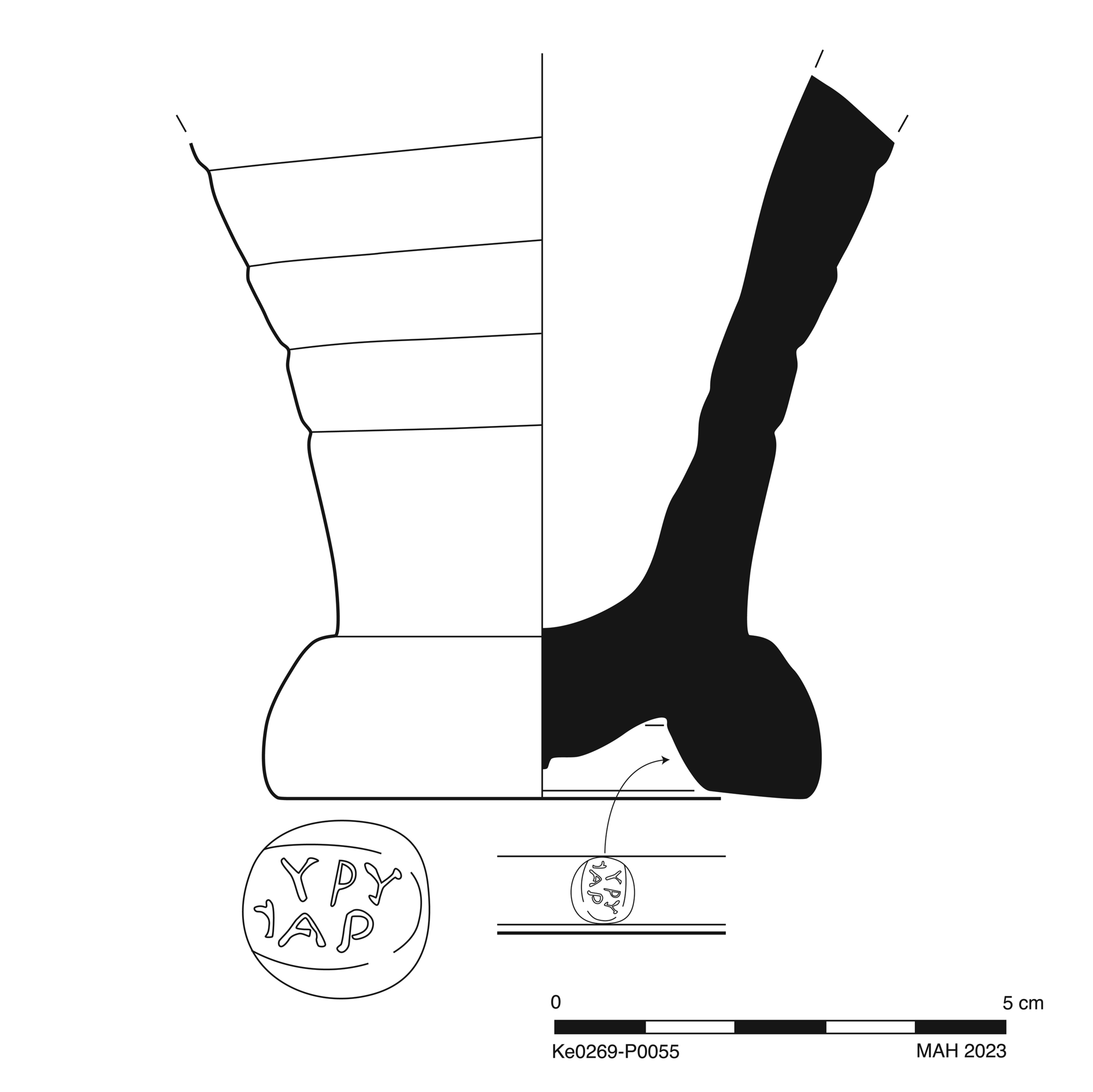 Amphora. Wide, short toe with flat resting surface, rounded outer face, and sloping inner face; button on bottom. Thick wall flaring upward. Fine spiral groove starting above toe. On inner face of toe, oval, shallow incuse stamp (W. 0.0072m) with letters in low relief: [-]ΥΡΥ|[-]ΑΡ