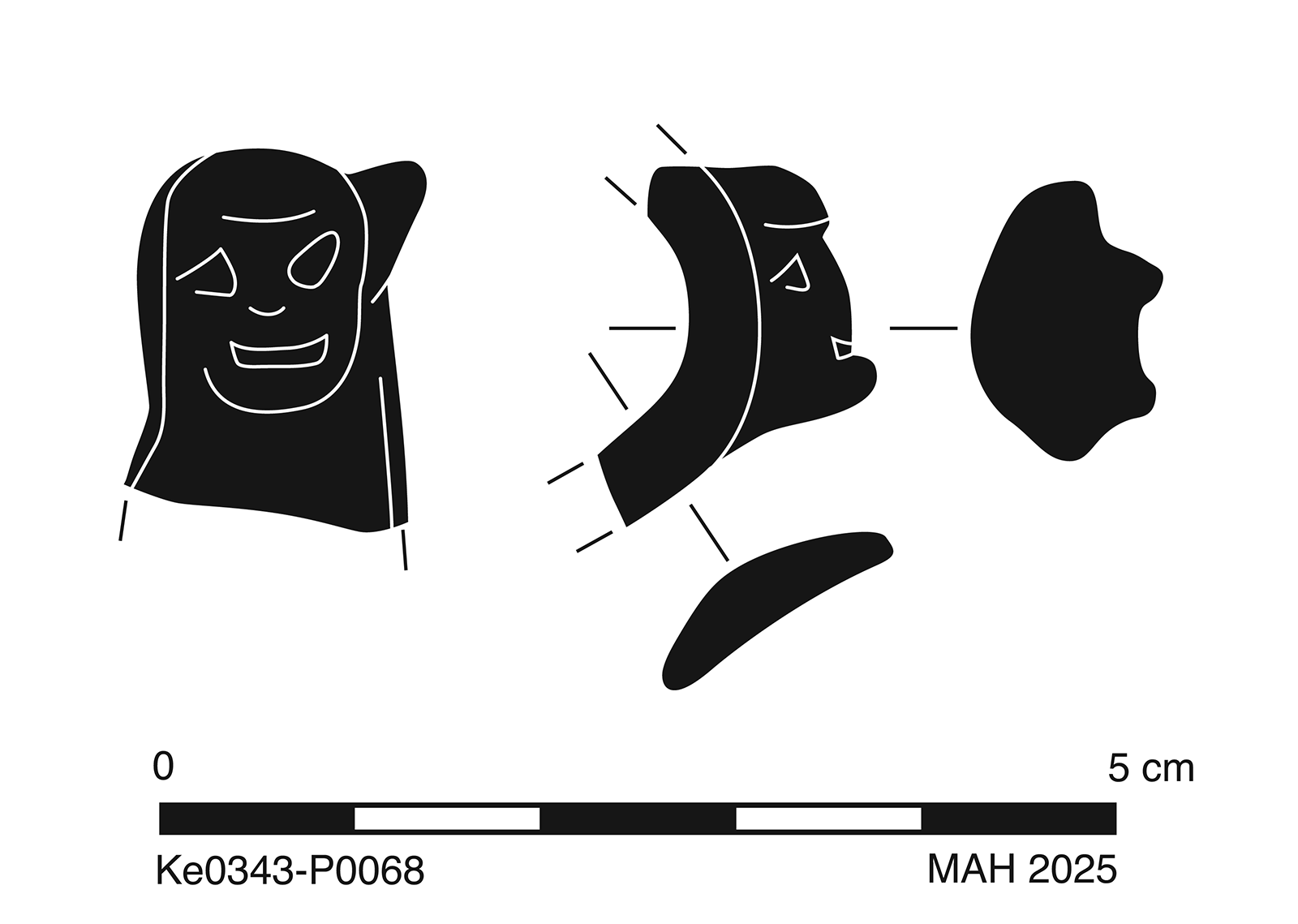 One small sherd preserves outer segment of one handle with comic mask appliqué. Moderate, extensive abrasion with sparse pitting; worn breaks; small, thin patches of encrustation.