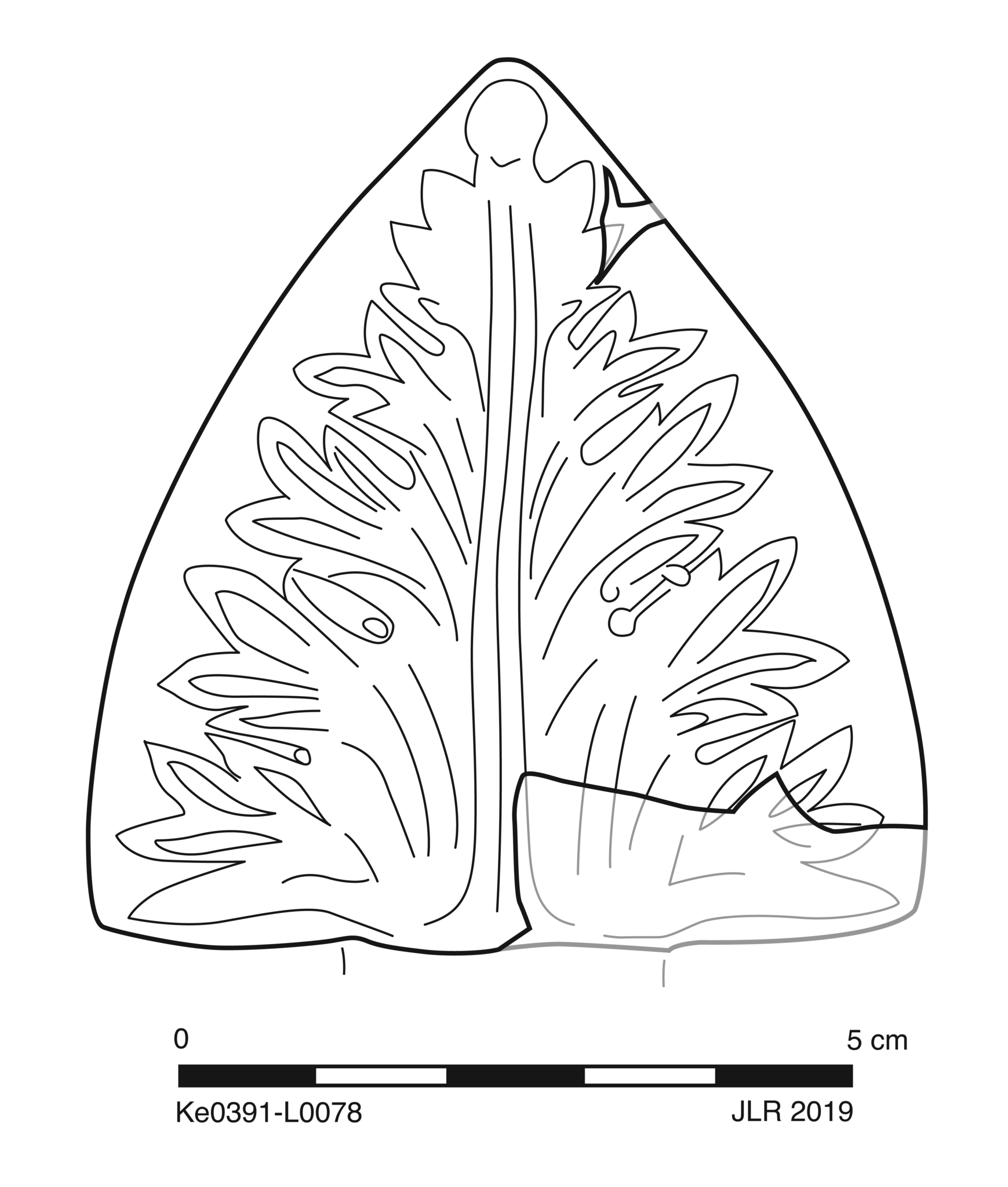 Large triangular handle ornament on thick post: relief of frilled acanthus leaf. Ring handle.
