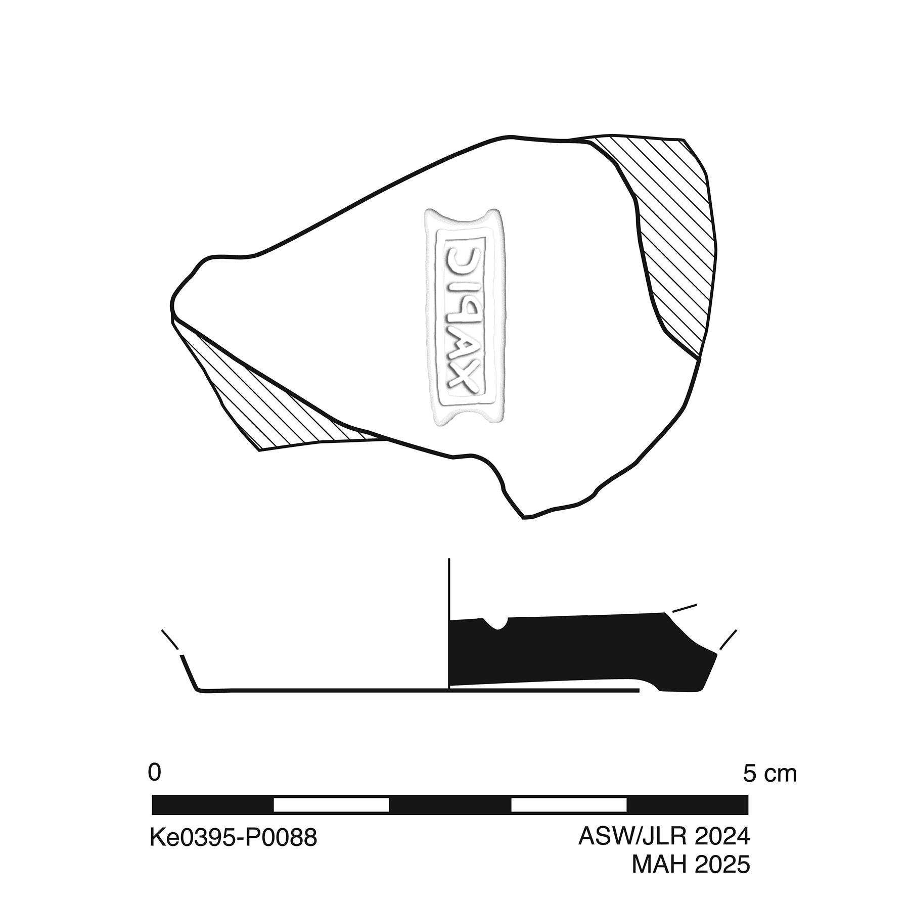 One sherd preserves 60% of base and floor. Slight, somewhat extensive abrasion and pitting; somewhat worn breaks; scattered specks of encrustation. Slip almost completely gone.