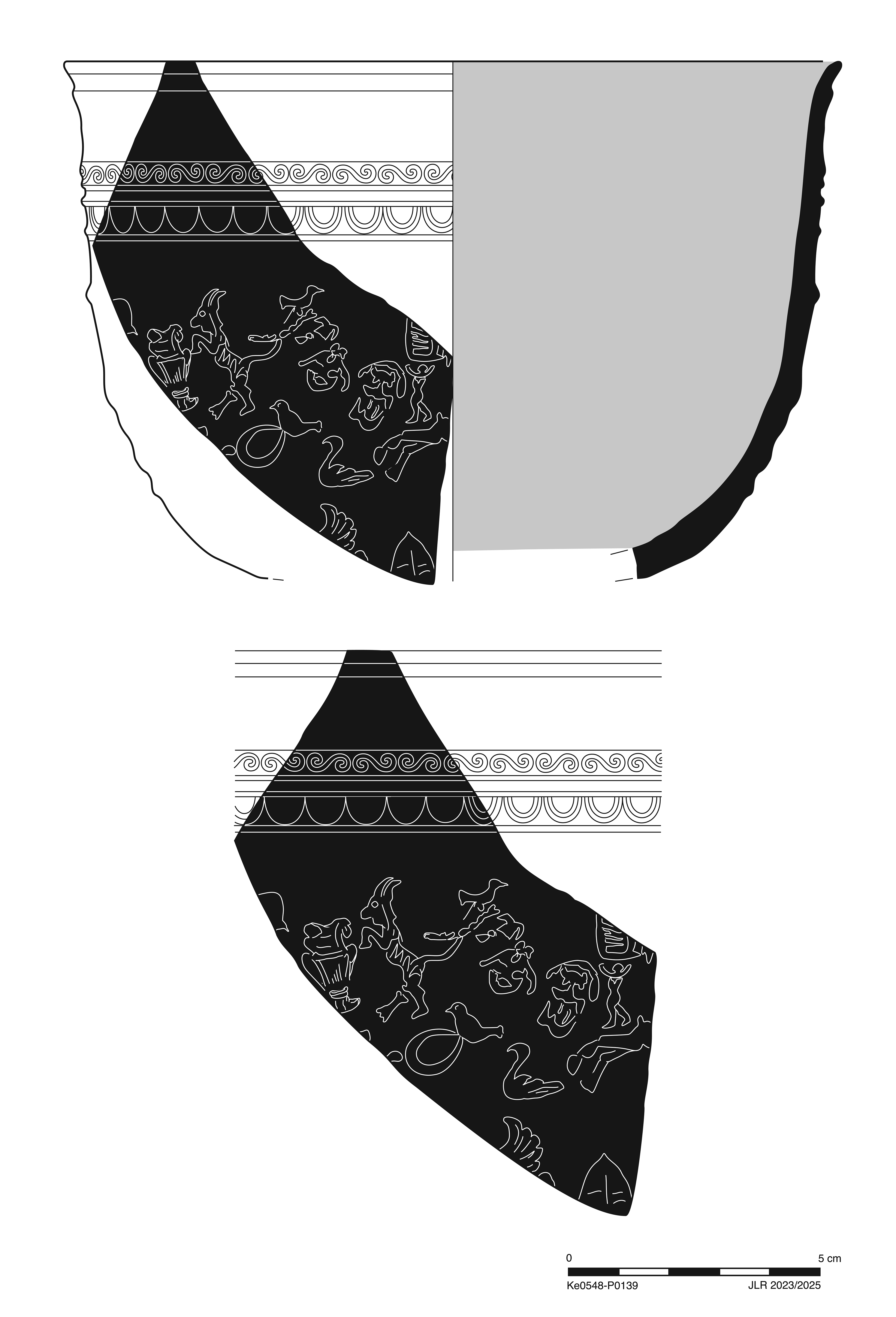 Two joining sherds preserve ca. 25% of bowl, including nearly full profile from rim to bottom. Slight to moderate, extensive abrasion and rare chipping; worn breaks; thin, extensive film across surfaces.