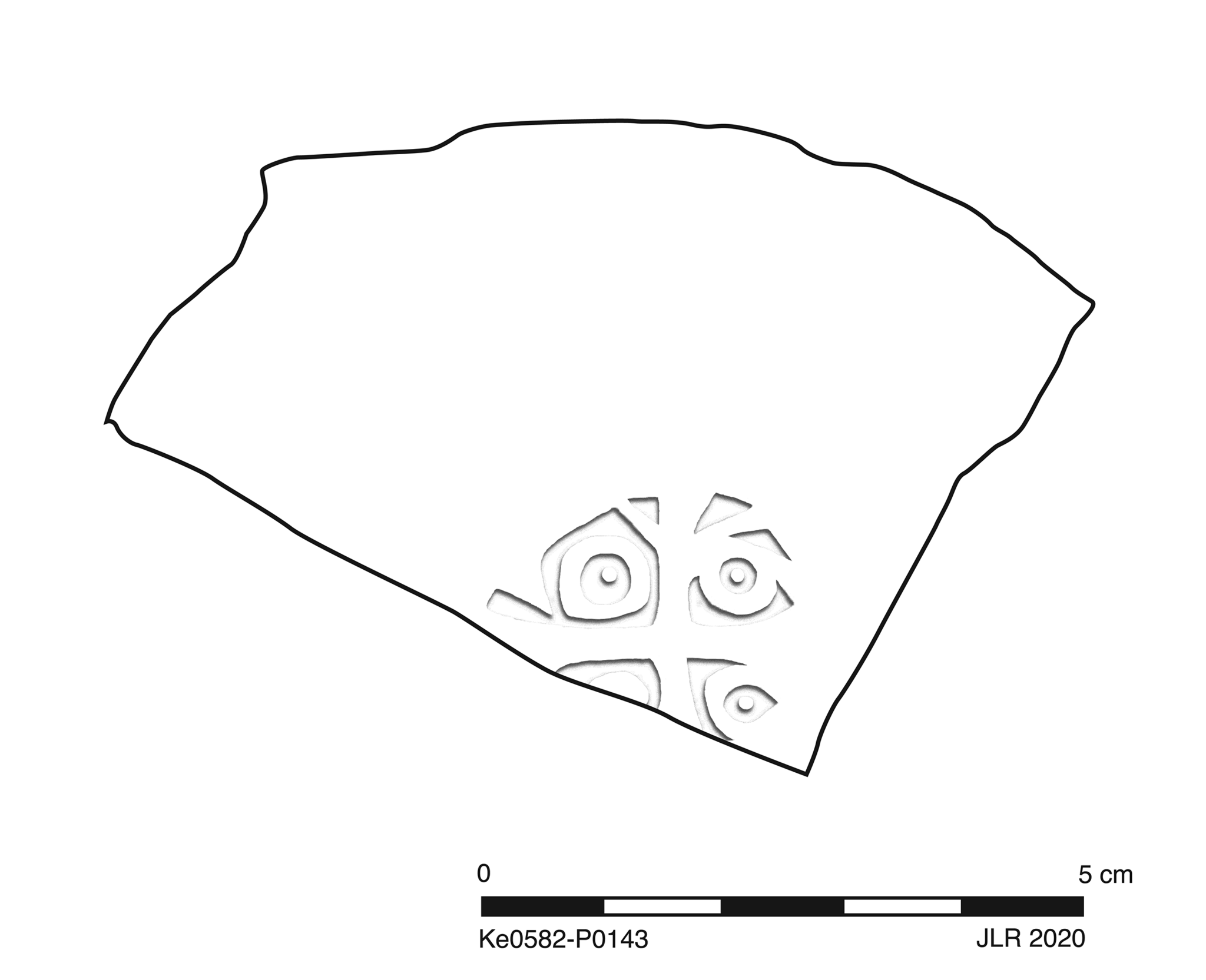 One sherd preserves ca. 35% of base. Very sparse, slight pitting; clean breaks; thin cloud of white discoloration across upper surface.
