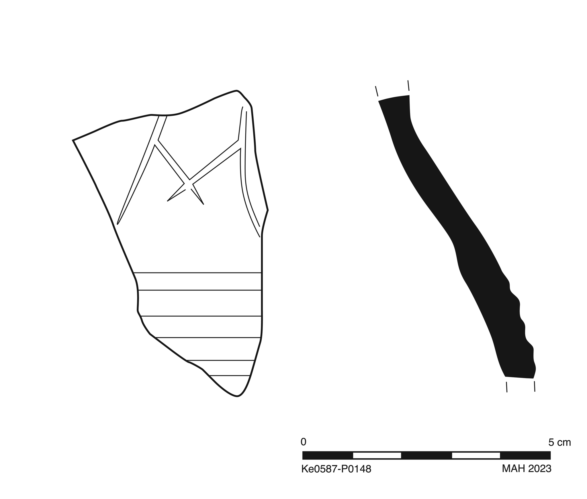 One sherd preserves small part of upper wall. Slight, extensive abrasion with scratching and flaking; worn breaks; thin film of encrustation across breaks.