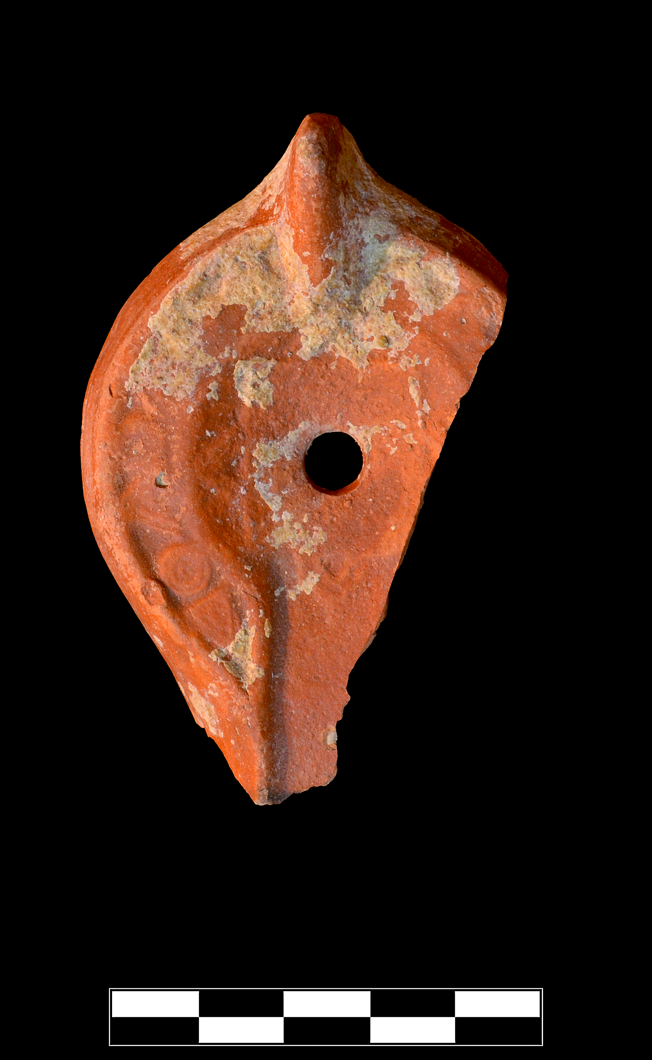 One large sherd preserves roughly 65% of lamp, including nearly entire discus, roughly two-thirds of shoulder and wall, small part of channel, entire handle, and toughly two-thirds of base. Slight to moderate, somewhat extensive abrasion and rare chipping; slightly worn breaks; and thick patch of encrustation at back.