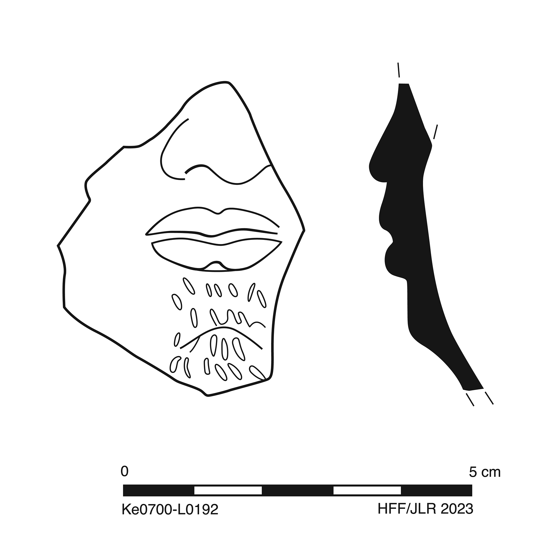 One sherd preserves part of middle to lower face on plastic lamp. Slight to moderate, somewhat extensive pitting and abrasion; slip is slightly flaking; worn breaks; rare specks of encrustation.