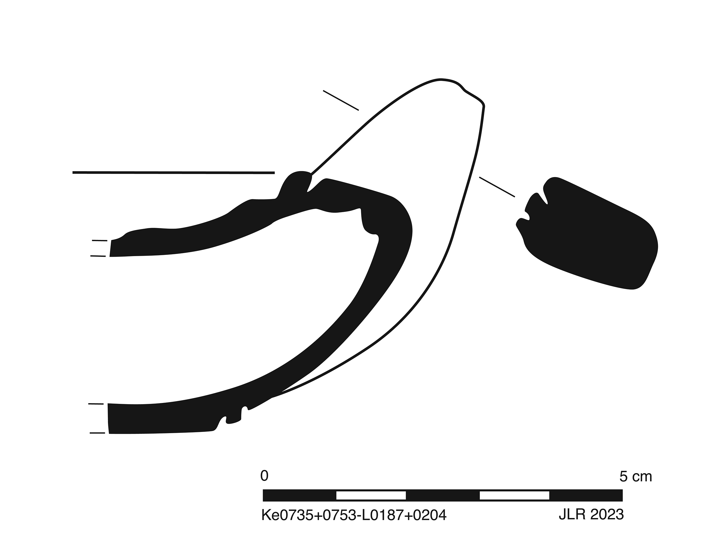 Three joining sherds preserves ca. 55% from center to back of lamp, including over one-half of discus and one-quarter of left shoulder (Ke 735) with back right shoulder, entire handle and adjacent back wall, and ca. 30% of bottom (Ke 753). Slight to moderate, sparse abrasion and pitting; slightly worn breaks; infrequent, thick patches of encrustation.