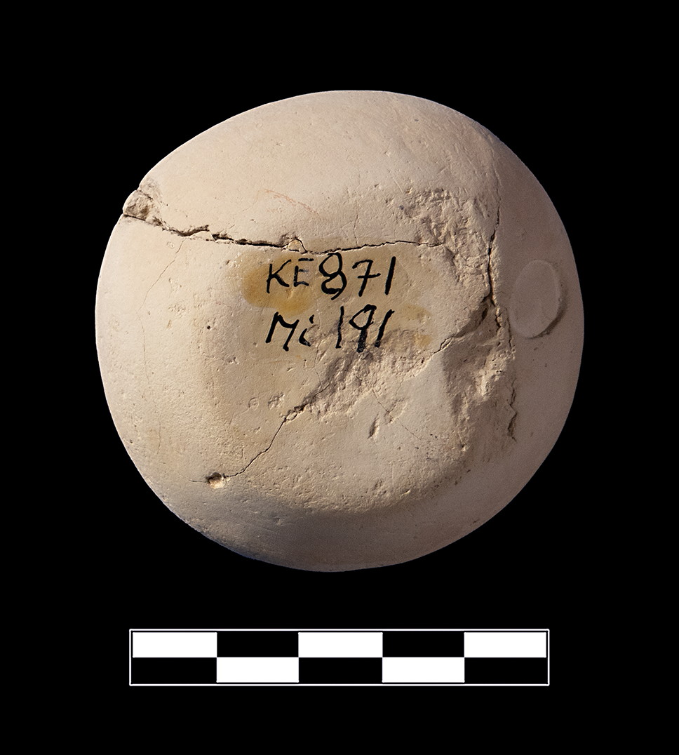 Conical loom weight tapering at inflection near bottom. Slightly concave base. Shallow stamp on lower face, impressed from gemstone but lightly so that details are indistinct: oval around relief (probably) of draped Aphrodite kneeling right.