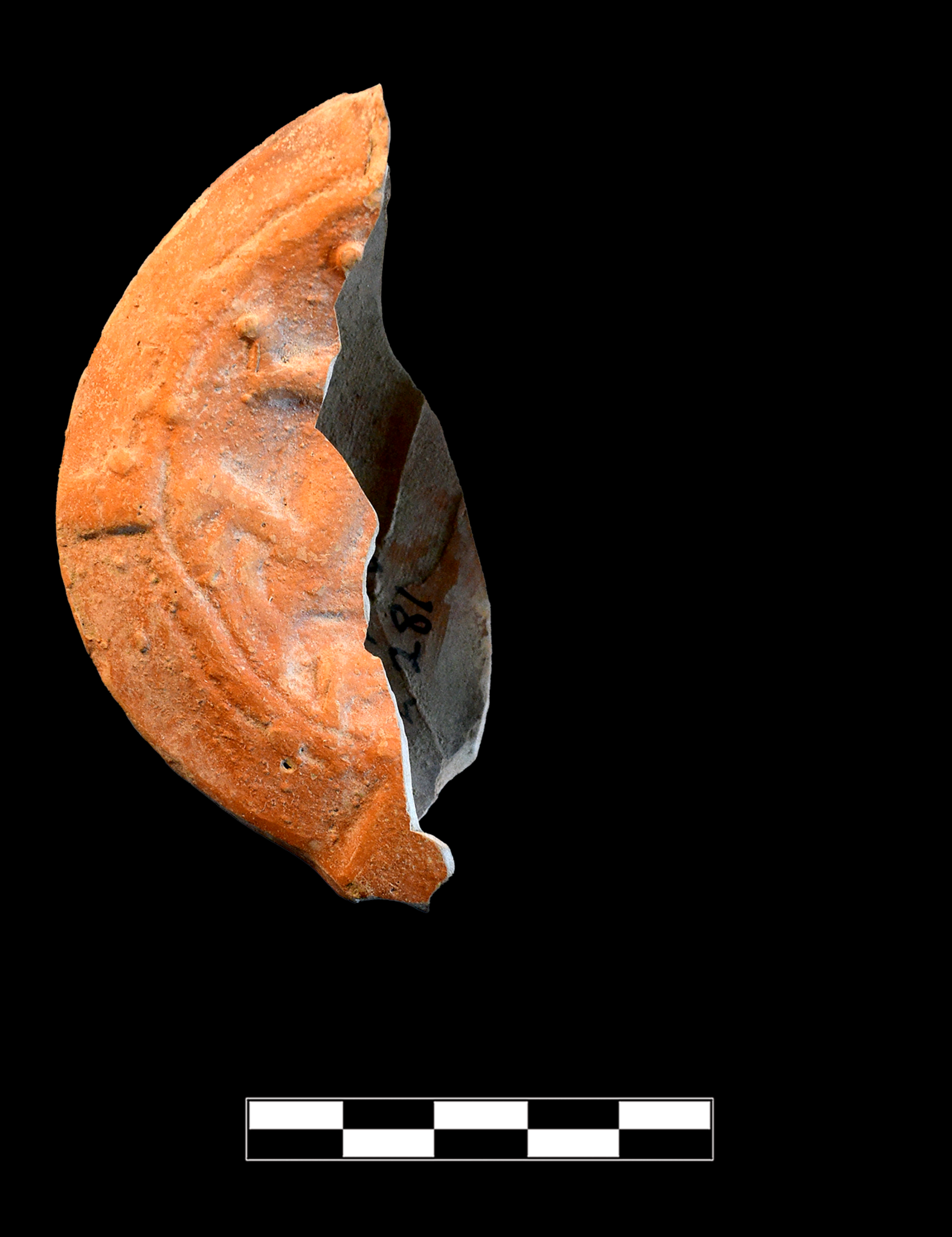 One sherd preserves ca. 30% from upper left part of lamp, including roughly one-quarter of discus and left shoulder from front handle to lateral edge of wickhole. Moderate, extensive abrasion and chipping around edges; worn breaks; scattered specks of encrustation.