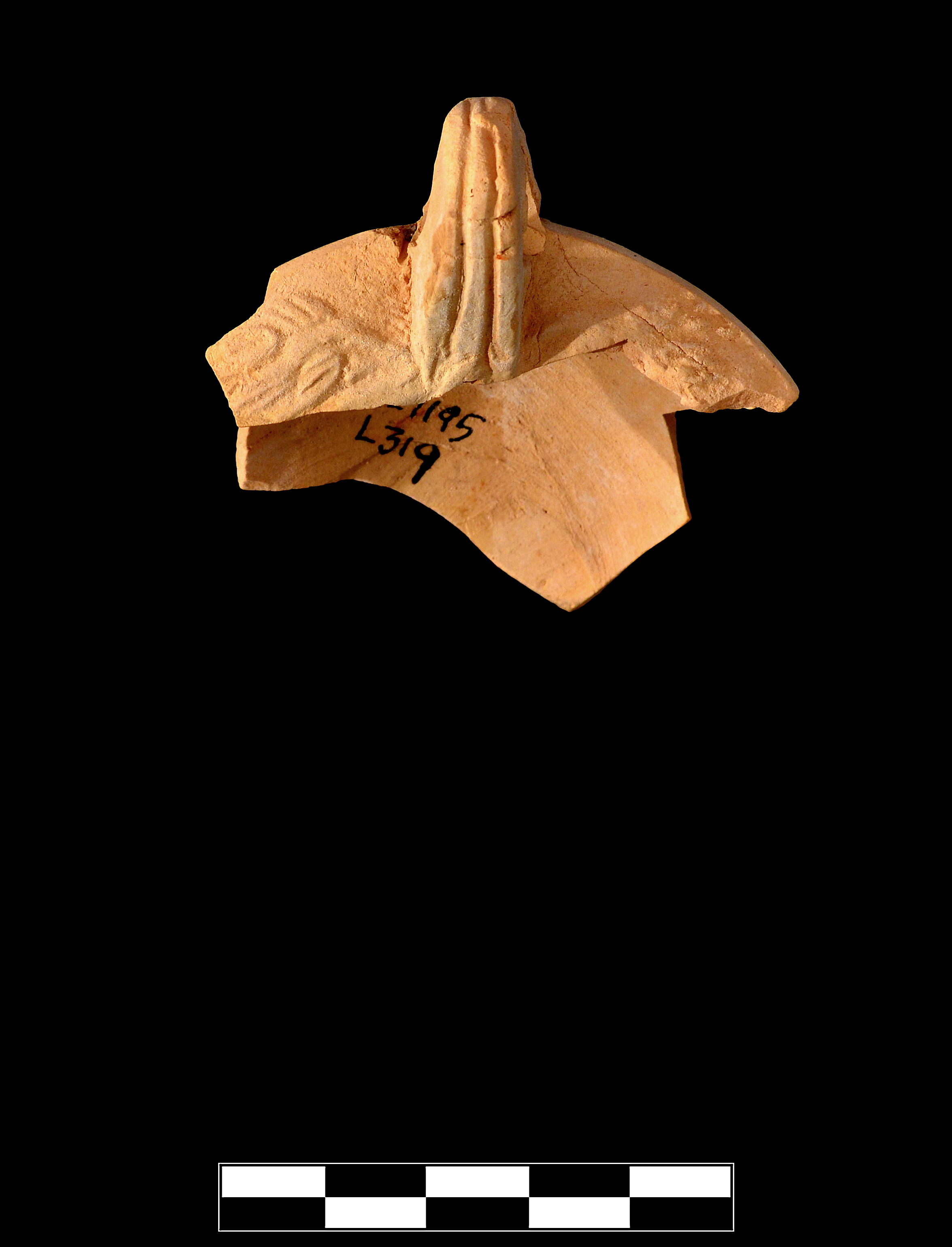 One sherd preserves ca. 20% of back of lamp, including small part of shoulder, entire handle, part of back wall, and less than one-quarter of base. Slight, sparse abrasion, chipping, and gouging; mostly clean breaks.