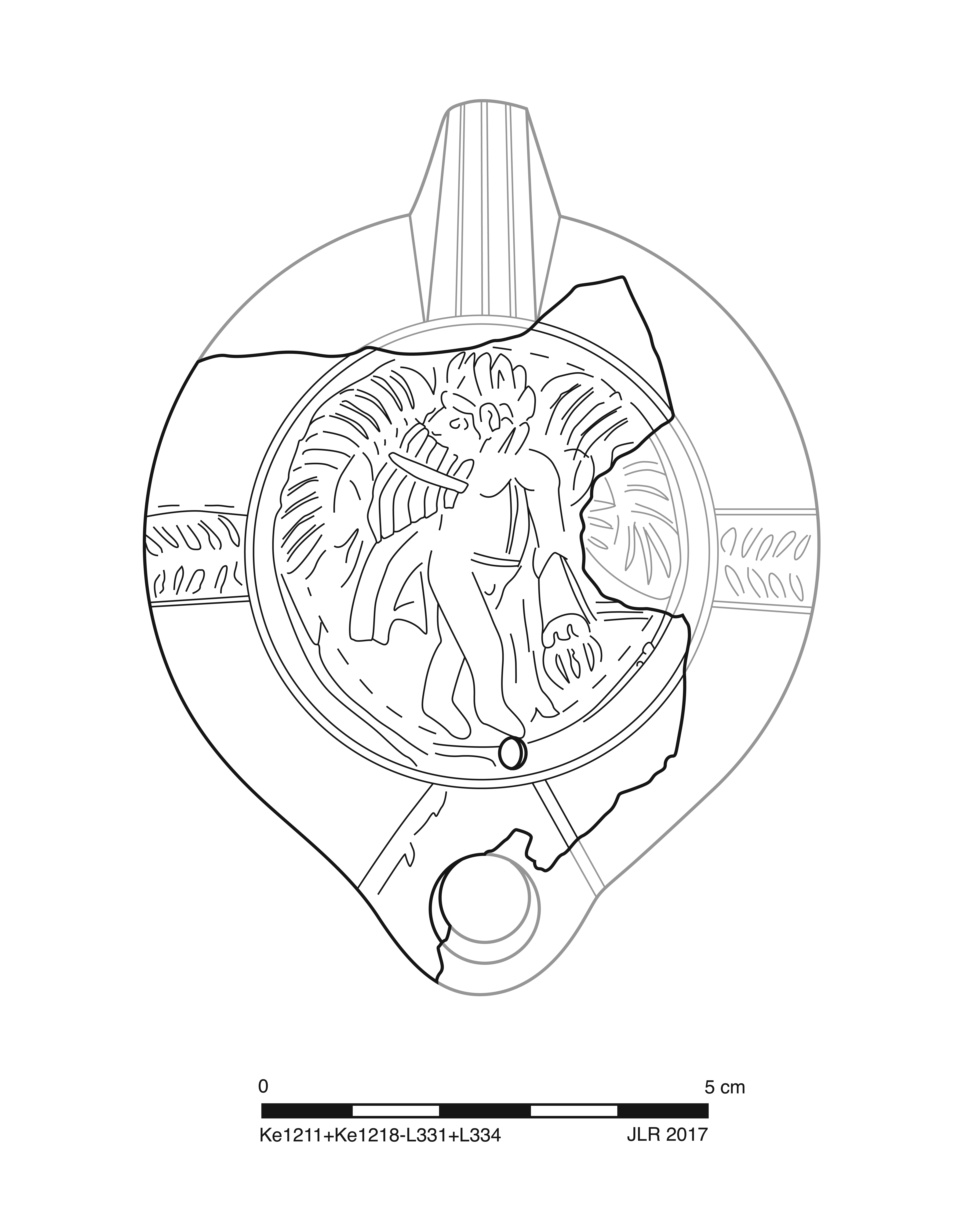 Four joining sherds preserve ca. 70% from upper part of lamp, including nearly all of discus, most of left shoulder, and roughly one-half of nozzle, and small part of front right base. Slight, somewhat sparse abrasion and chipping; worn breaks; sparse specks of encrustation. Burning around nozzle from use.