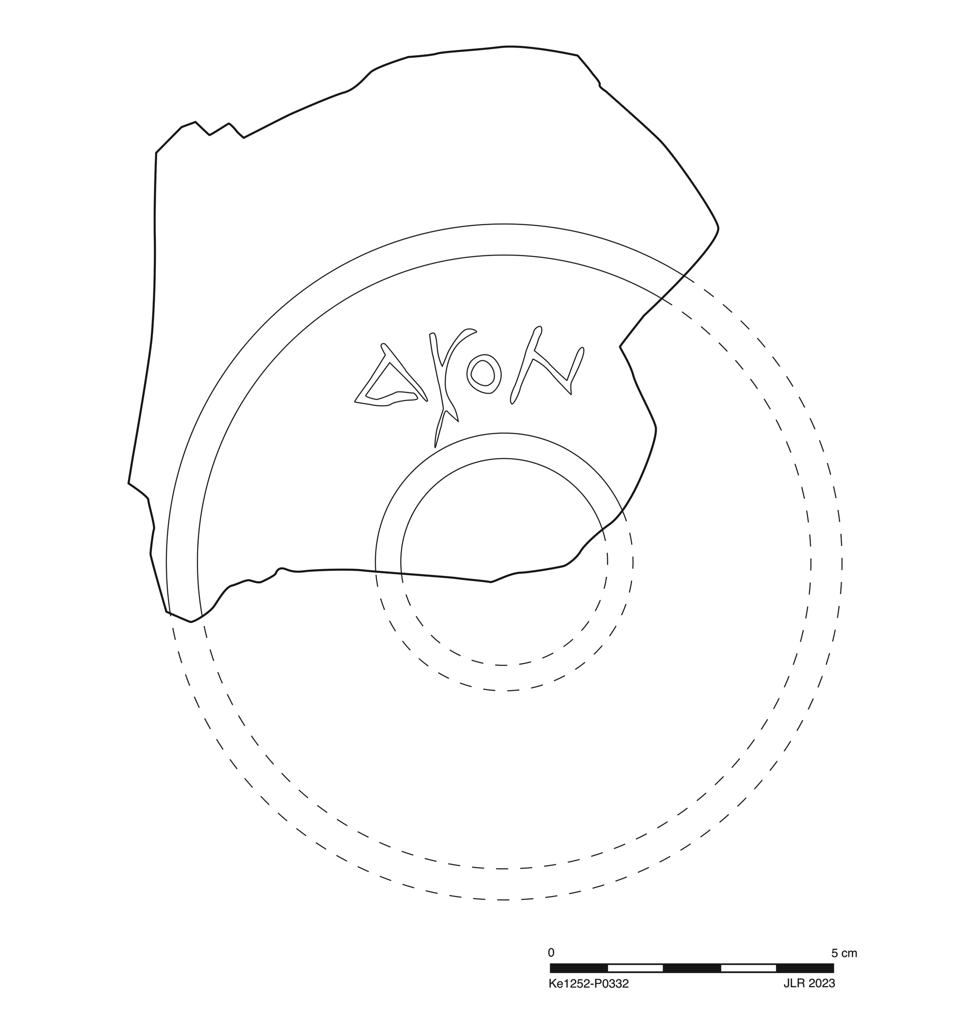 One large sherd preserves ca. 30% of base and lower wall. Moderate, infrequent abrasion and scratching and large chips from surface and edges; worn edges; scattered specks of encrustation.