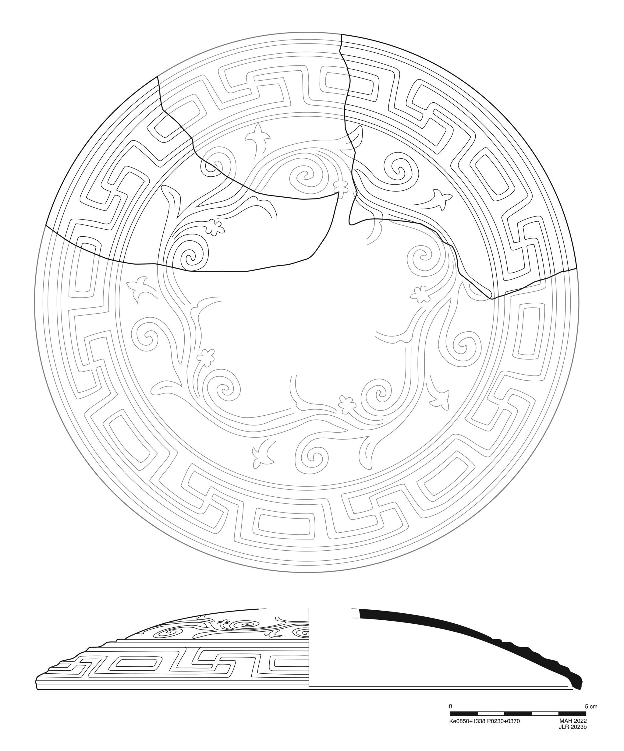 Lid with moldmade decoration. From edge in an outermost light groove is partially present; wide band of meander; bead within the band. Interior is alternating vine with flowers of three or four leaves. Top part is plain where extant.