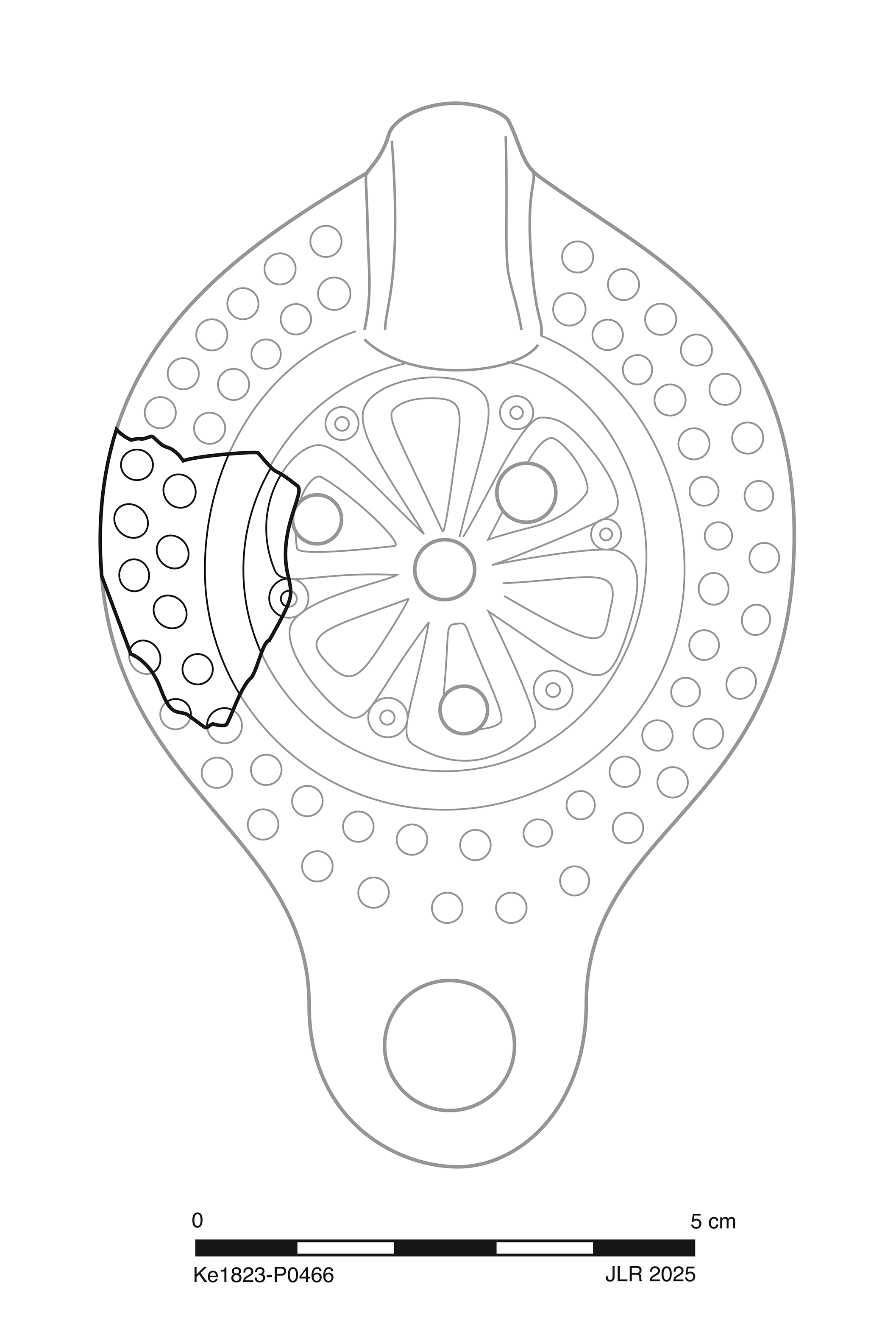 One small sherd preserves <20% of shoulder and small part of discus. Slight, sparse abrasion and pitting; worn breaks; thin, extensive encrustation.