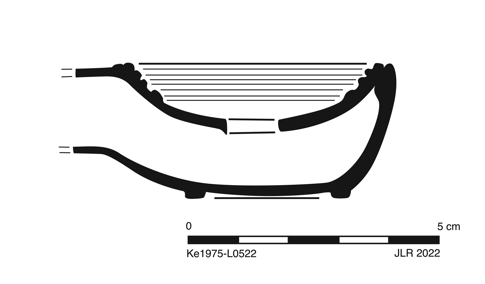 Intact but missing front nozzle. Slight to moderate, extensive abrasion and minor chipping; moderately well preserved slip; worn breaks; uncommon specks to small patches of encrustation.