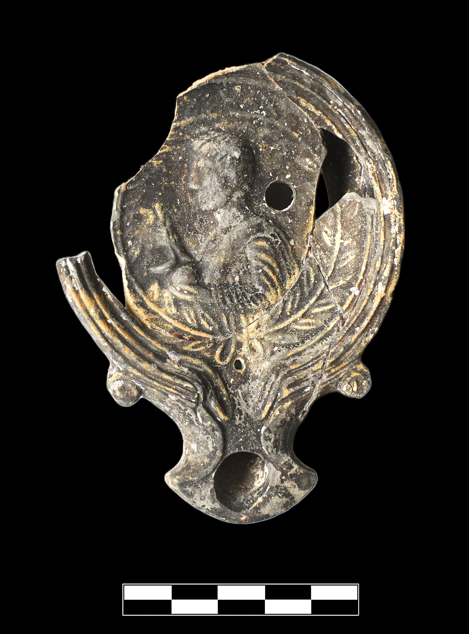 Six joining sherds preserve most of discus, entire nozzle, entire base and adjacent walls. Slight, sparse abrasion and minor chipping around edges; slightly worn breaks; sparse patches of encrustation; overall very friable. Weathering consistent with long marine submersion.