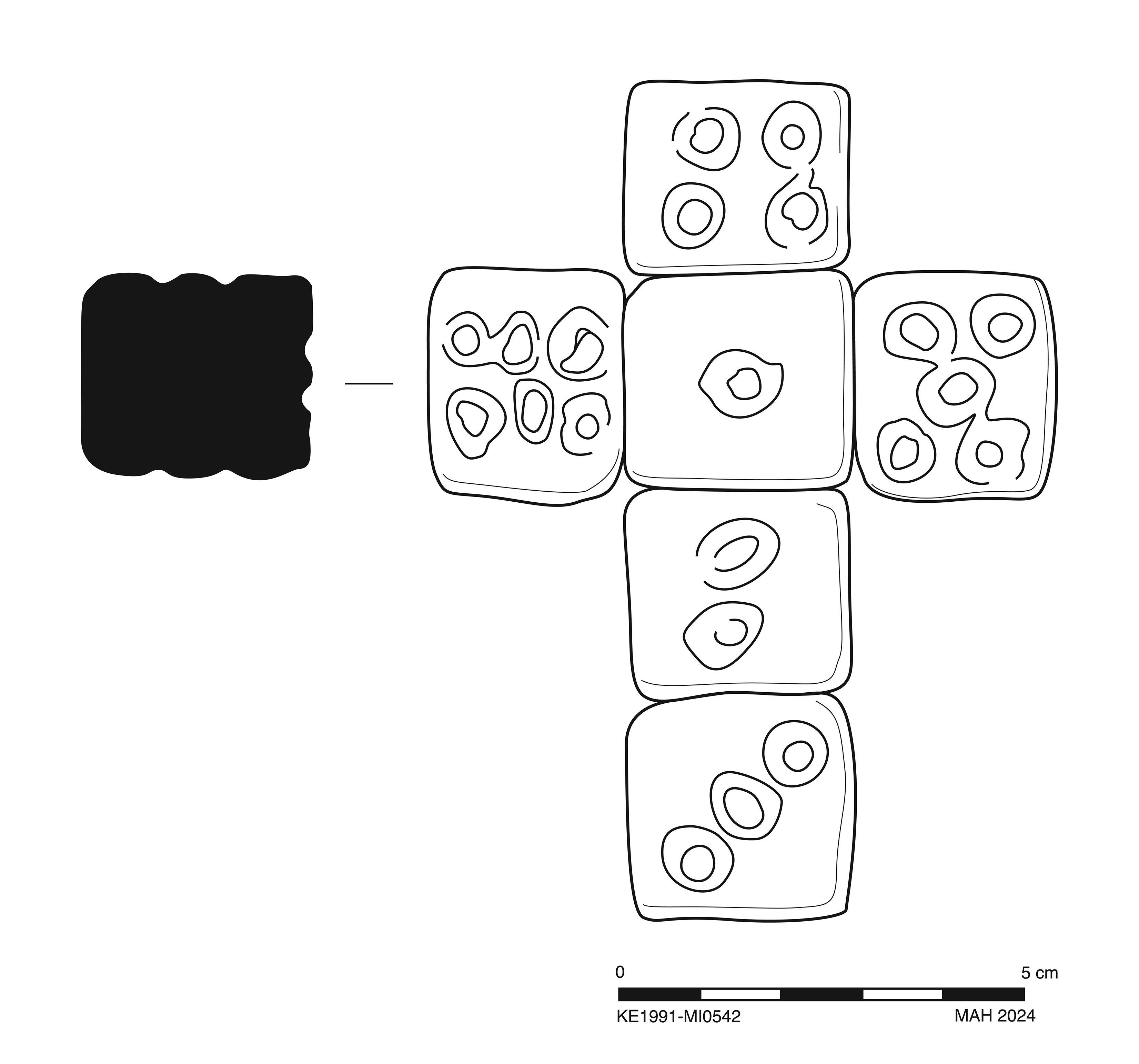 Cuboid die. Incised circles marking counts 1-6 in conventional format across six sides.