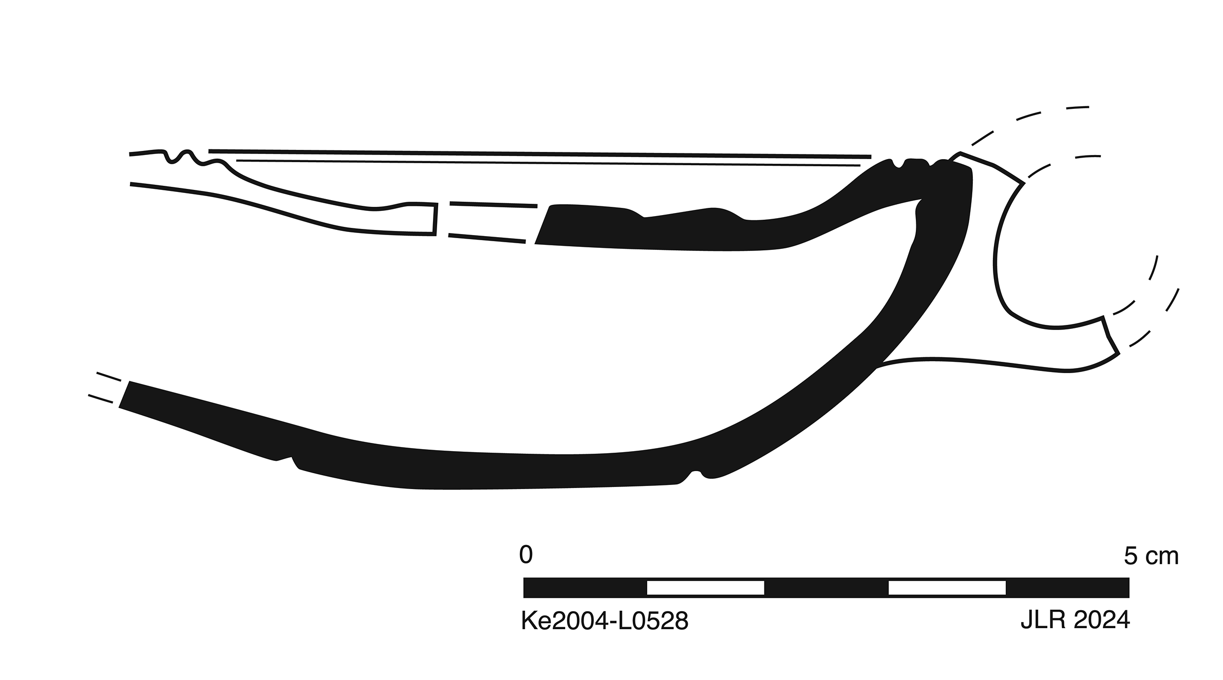 One large sherd preserves back 50% of lamp but missing top of handle and entire nozzle. Slight to moderate, extensive abrasion with scratching and pitting, minor chipping around edges; worn breaks; rare patches of encrustation.