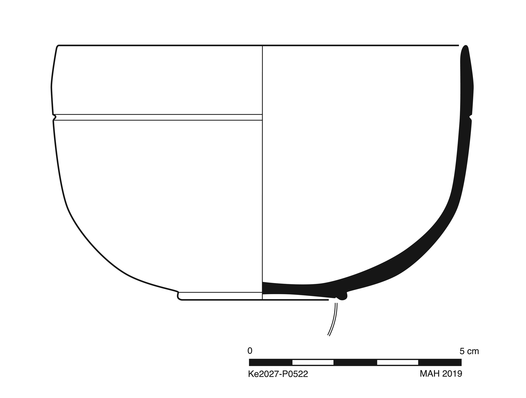 Hemispherical bowl. Small ring foot, rounded, but groove on inside; slightly convex underside. Upper wall straight, with single groove. Plain, slightly pointed lip.