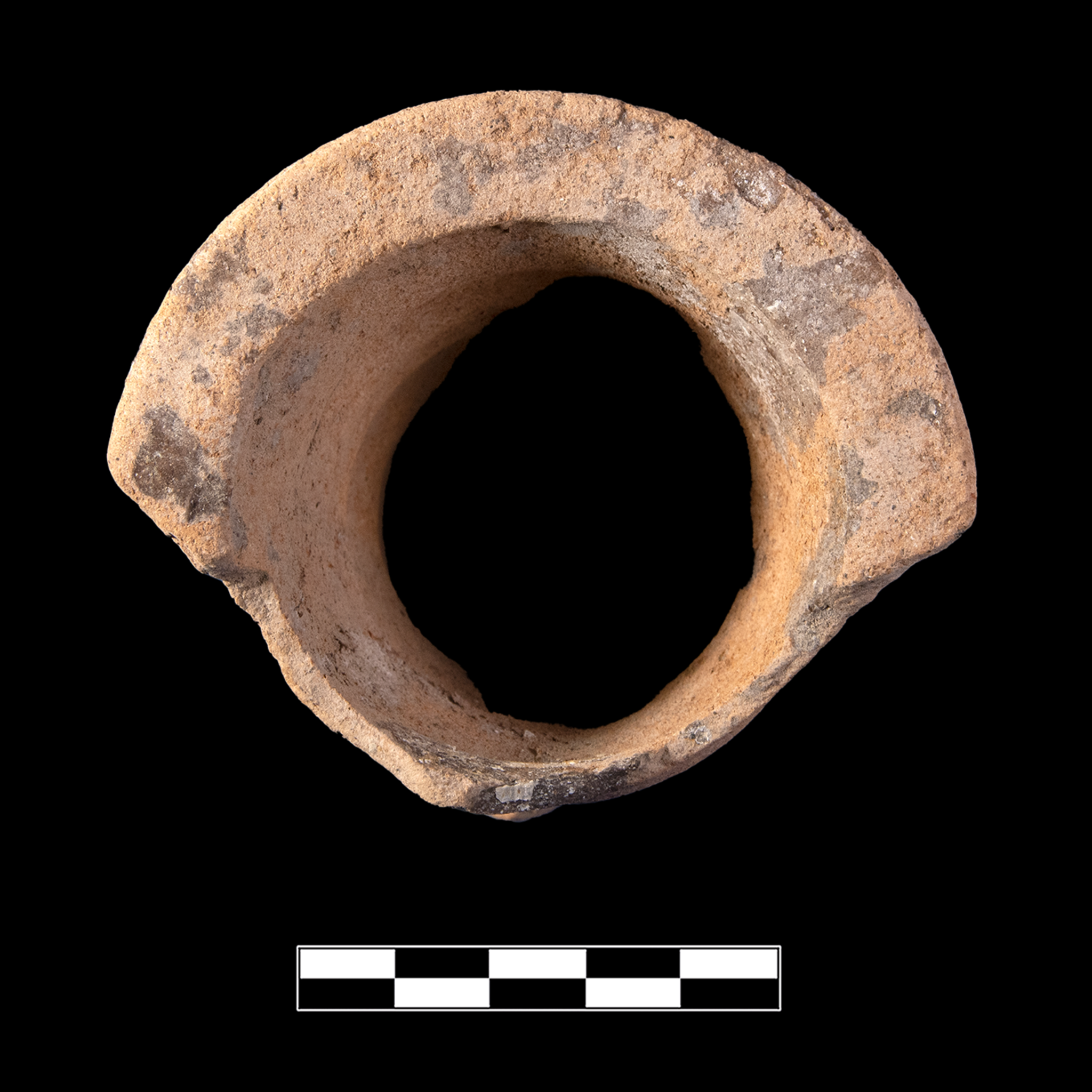 One large sherd preserves entire base and very small part of lowermost wall. Extensive, slight abrasion with very slight chipping around edges; worn breaks; somewhat thick, widespread patches of encrustation varying from gray to brownish black.