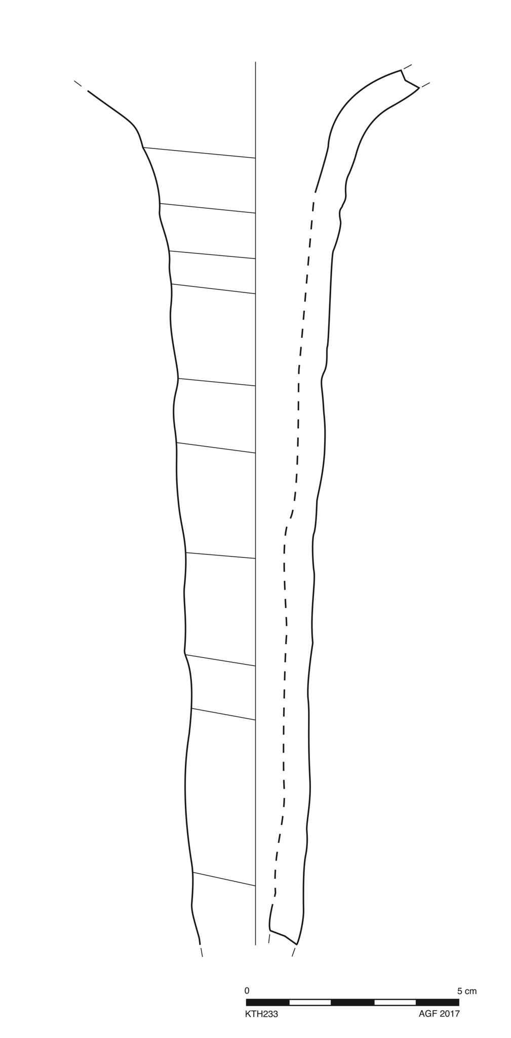 Wide flaring lower body; tall cylindrical spout tapers toward mouth. Surface has spiral banding (H. 0.014 m) on exterior.