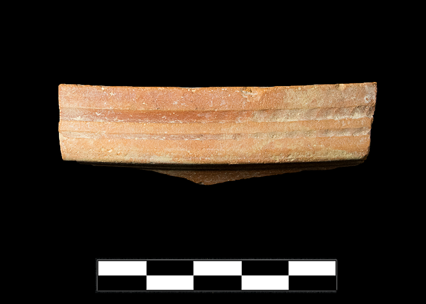 One sherd preserves 8% of rim and small part of upper body. Slight, sparse abrasion and chipping especially round edges; worn breaks; slight patches of encrustation.
