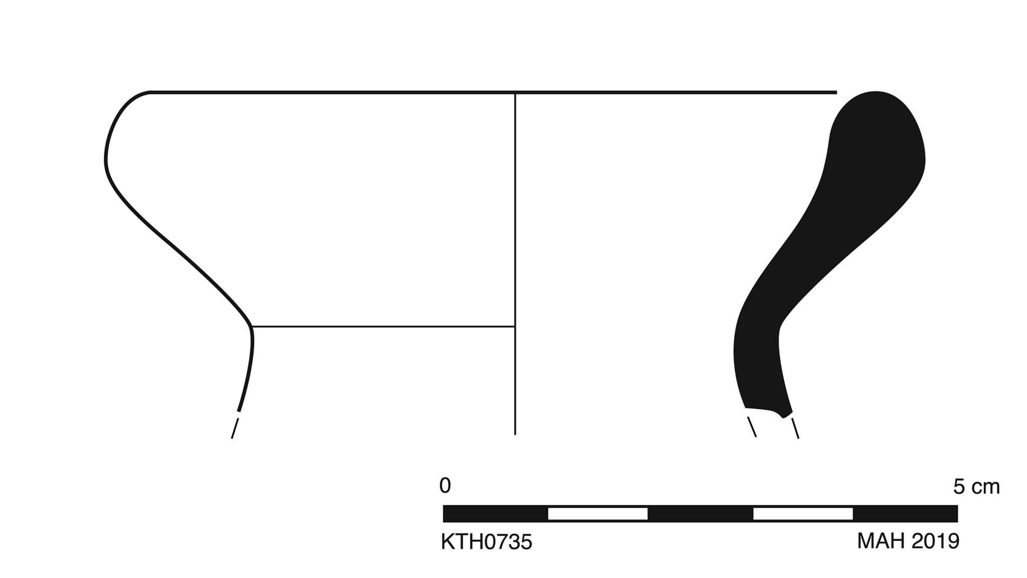 One sherd preserves 45% of rim and uppermost neck. Slight, sparse abrasion and chipping around edges; mostly clean breaks; irregular patches of encrustation. Viscous, reddish brown stain on lip: postdepositional (pine sap?).