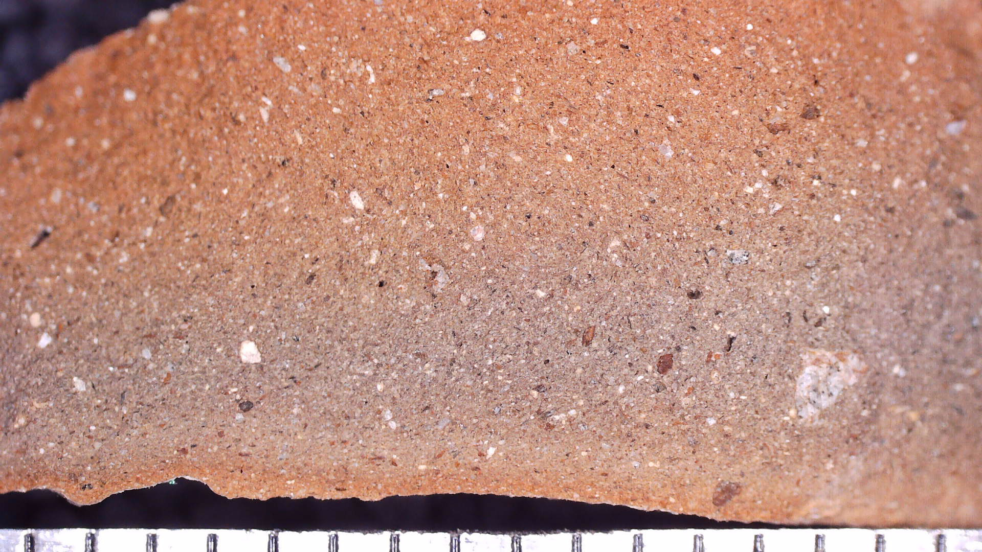 SCA Fabric A: reddish brown fabric fired slightly darker at surface; hard, slightly coarse; gritty surface and slightly granular break; tiny golden micaceous flakes at surface; uncommon, small, rounded, lime and quartz; other tiny light bits. Eastern Aegean/western Asia Minor.