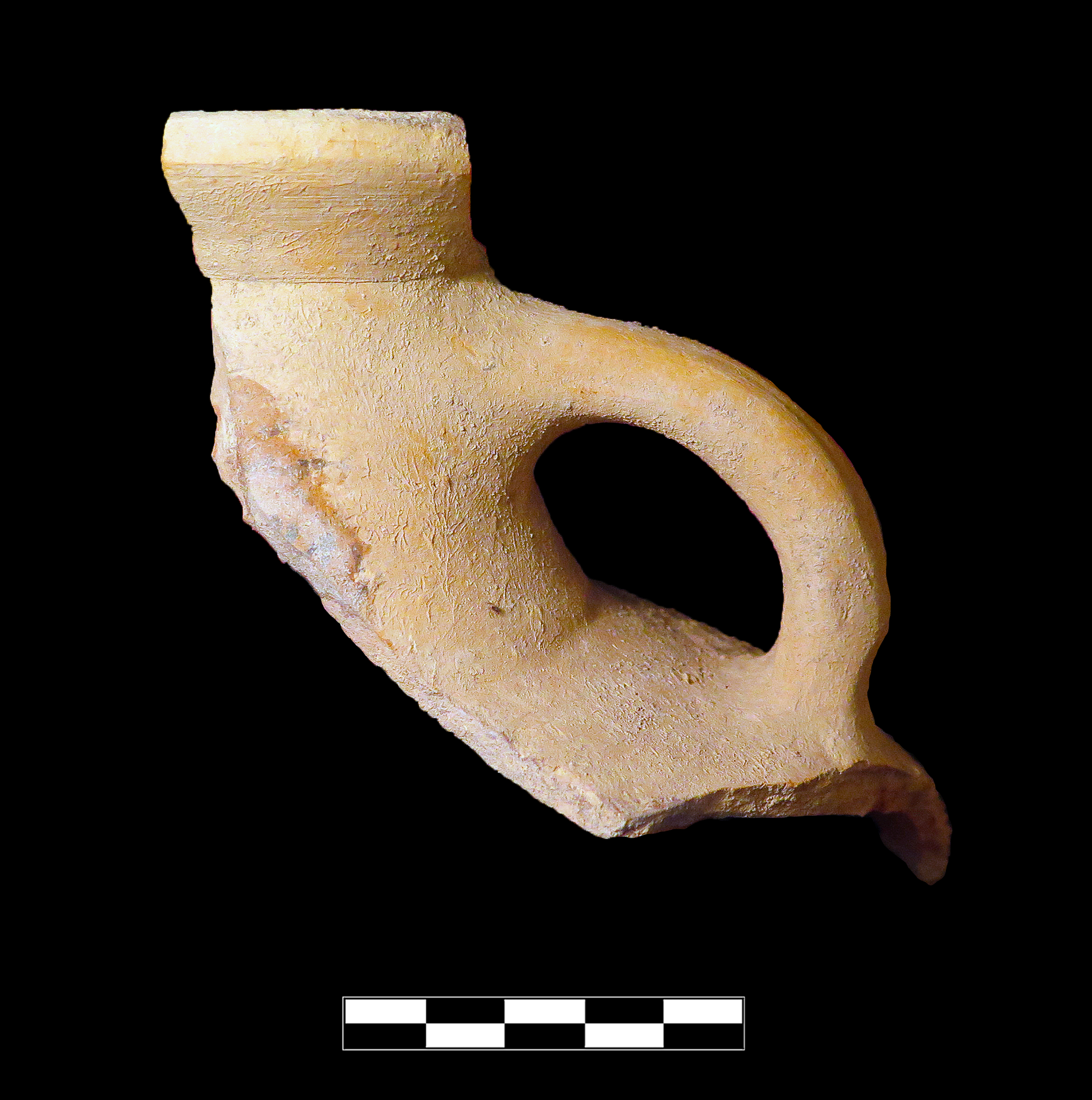 One sherd preserves 15% of rim and entire profile of neck to shoulder and one entire handle. Slight, sparse abrasion and rare scoring; somewhat worn breaks; wide patches of encrustation.