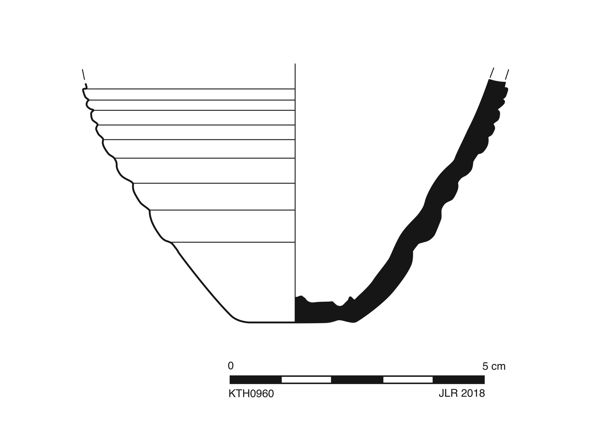 Medium coarse fabric, hard, is inconsistently fired from light reddish-brown to grey with frequent small dark rounded inclusions and occasional medium light angular inclusions; other tiny bits; several medium to large dark and light angular inclusions embedded in exterior surface. Interior is grey with light brush marks; exterior is light reddish-brown with ridging.