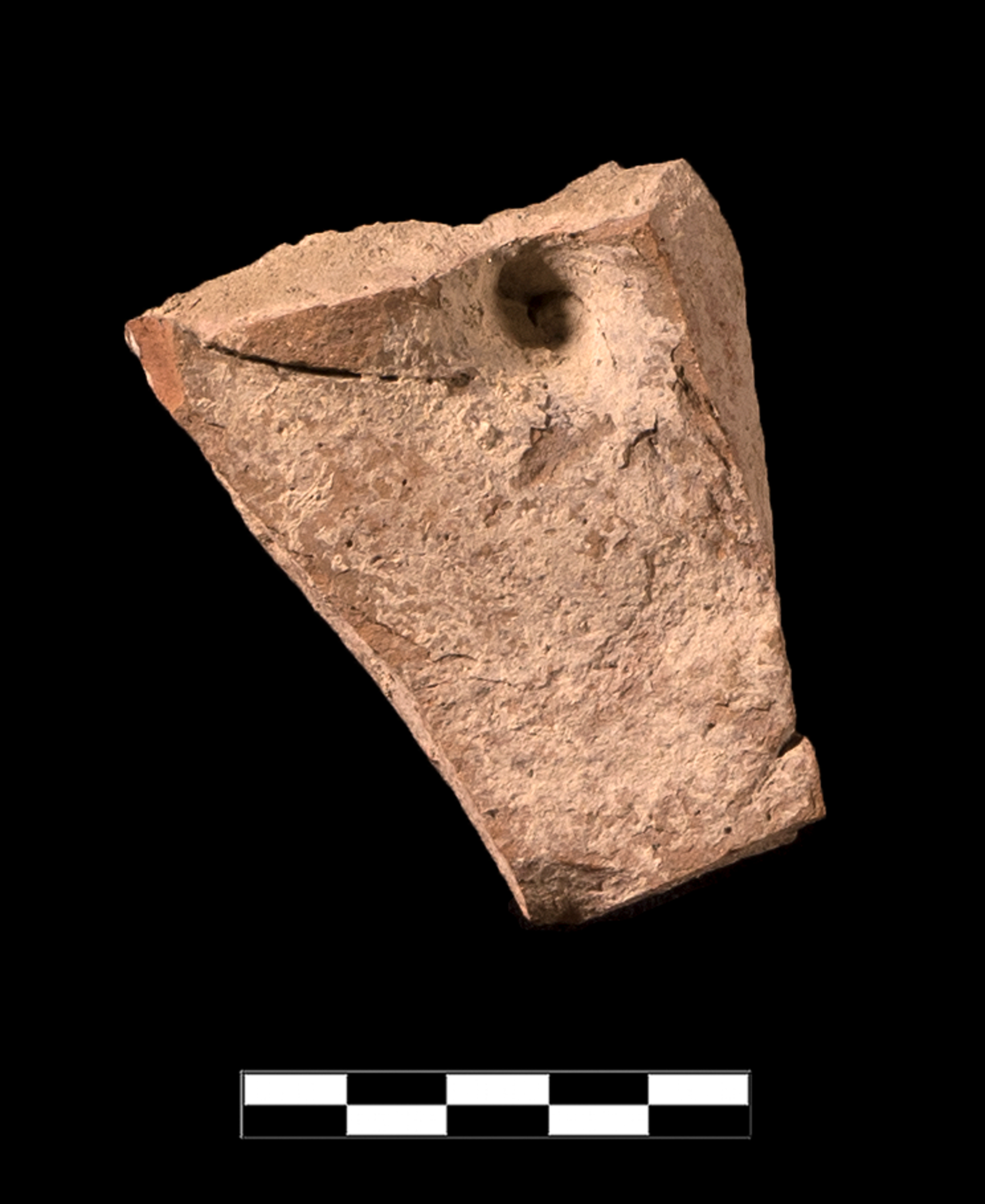Granular fabric has frequent small, subangular, white and light gray inclusions; rare golden mica flecks; and rare tiny voids. Exterior surface is pale light brown; interior is brown. Regional.