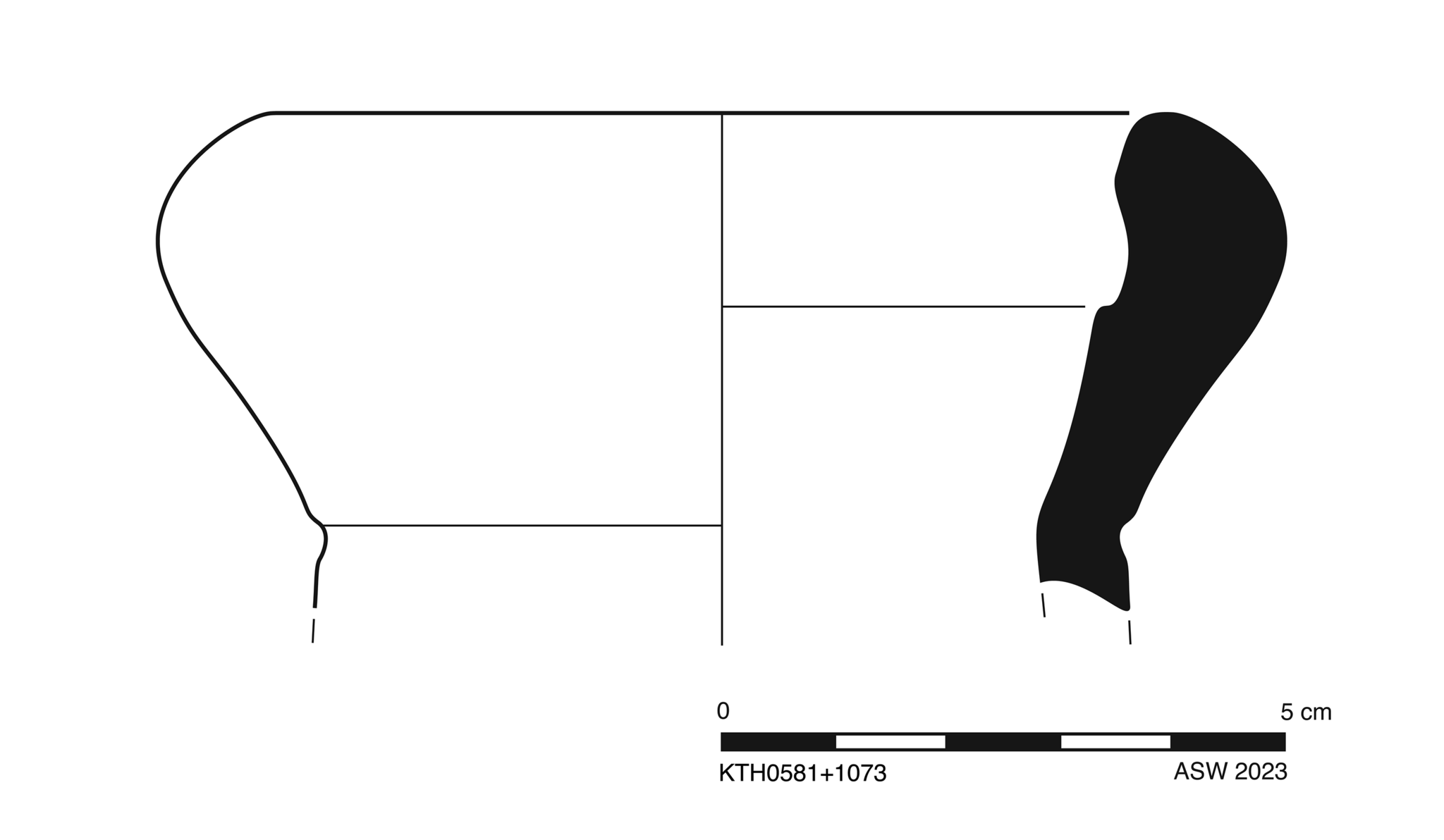 Two joining sherds (1073+0581) preserve 75% of rim and small part of upper neck. Slight, sparse abrasion and minor scratching and chipping around lip; slight worn breaks.