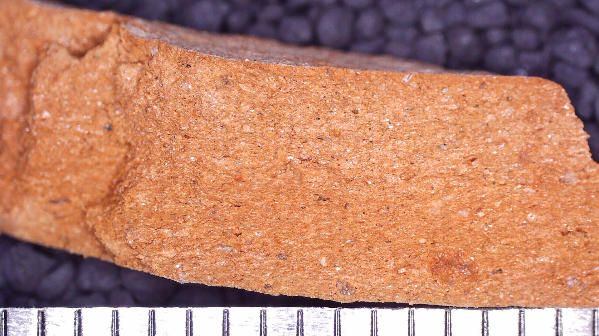 Reddish brown, consistently fired. Hard, medium coarse; slightly hackly break, slightly rough texture. Tiny to small, poorly sorted, mixed dark gray to black, few red, and white to offwhite (some calcareous) inclusions; dense flecks of golden mica. Ionian coast.