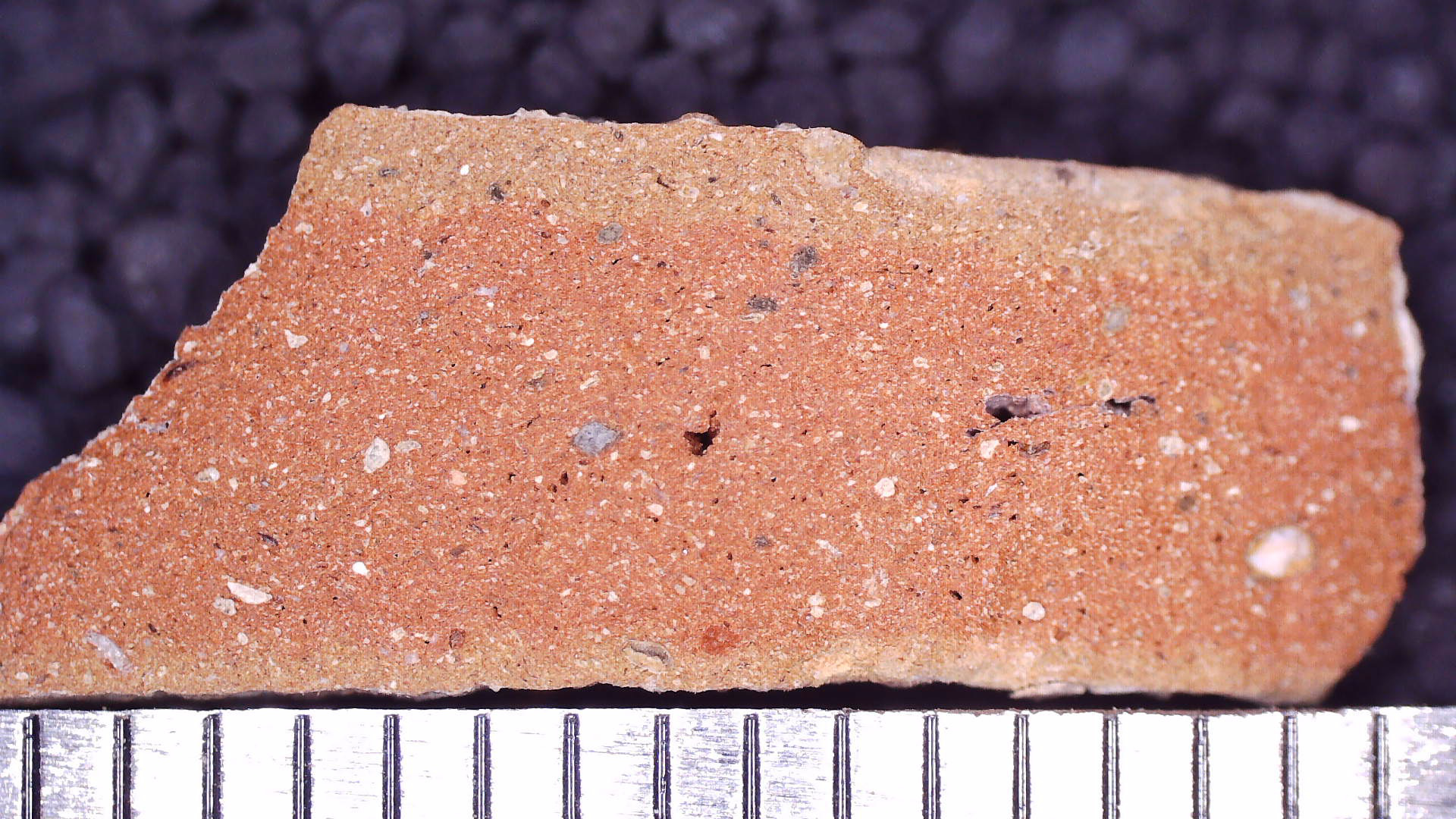 SCA Fabric A: brown with a tinge of red but fired golden brown at outside surface (2 mm); medium fine, hard; smooth to granular break; rare to uncommon, tiny to small, white to offwhite (calcareous and quartzitic) and red to gray inclusions; faintly micaceous. Surface well smoothed. Eastern Aegean-western Asia Minor.