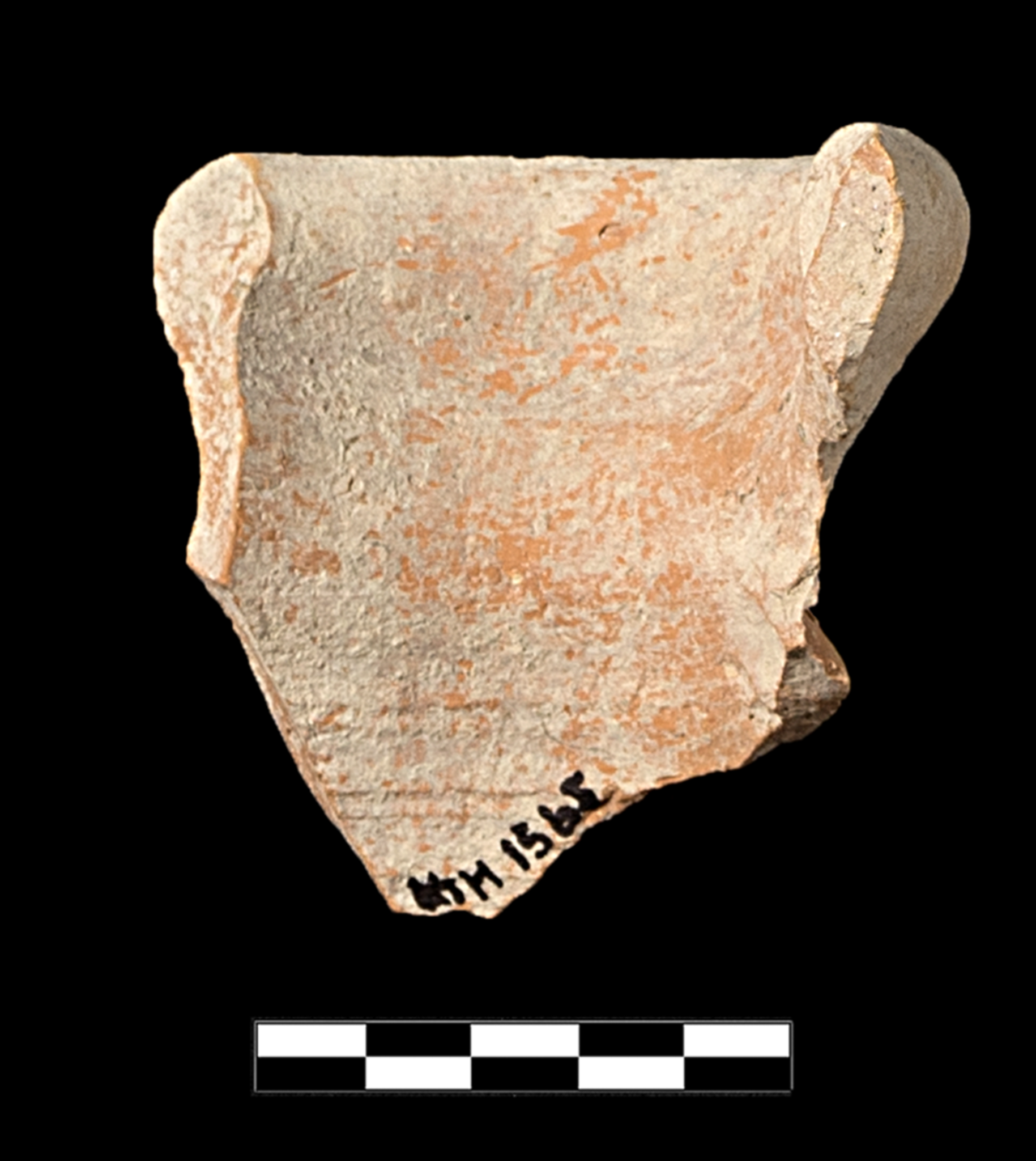 One sherd preserves 45% of rim and small part of neck. Slight, sparse abrasion and scoring; worn breaks; thin, extensive encrustation.