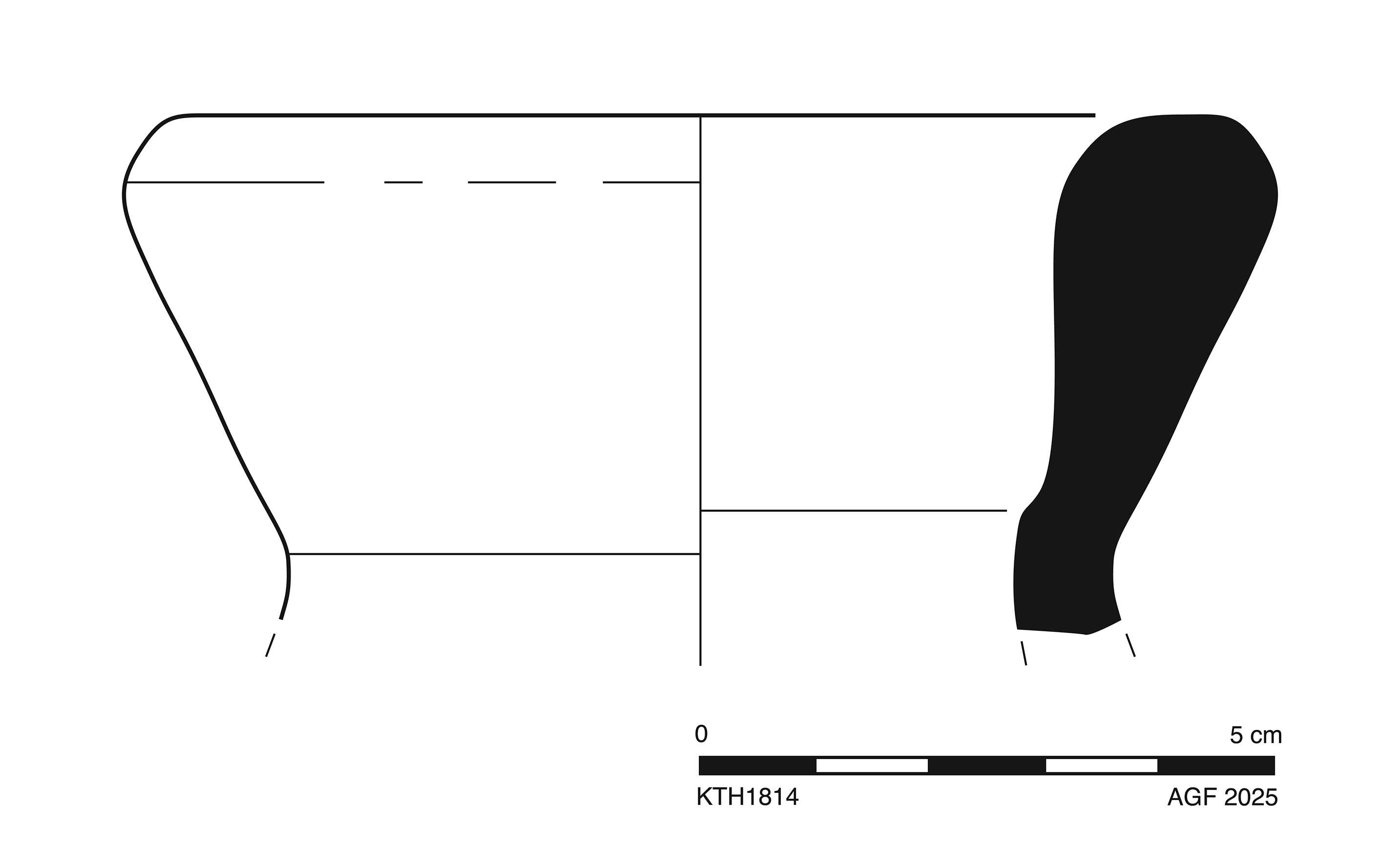 One sherd preserves 15% of rim and small part of upper neck. Somewhat slight, sparse abrasion and minor gouging; somewhat worn breaks; scattered spots of encrustation.